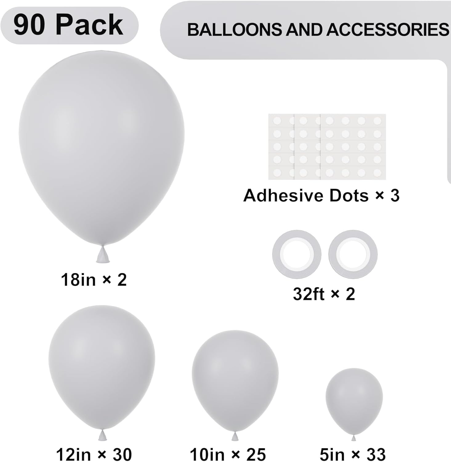 • Abundant Package: Includes total 90pack matte gray latex balloons: 2pcs 18inch, 30pcs 12inch, 25pcs 10inch, 33pcs 5inch and 3 sheet of adhesive dots, 2 rolls of ribbons. Designed for easy inflation and set up, Voircoloria matte grey balloons save you time and effort, so you can focus on enjoying your celebration without any hassle