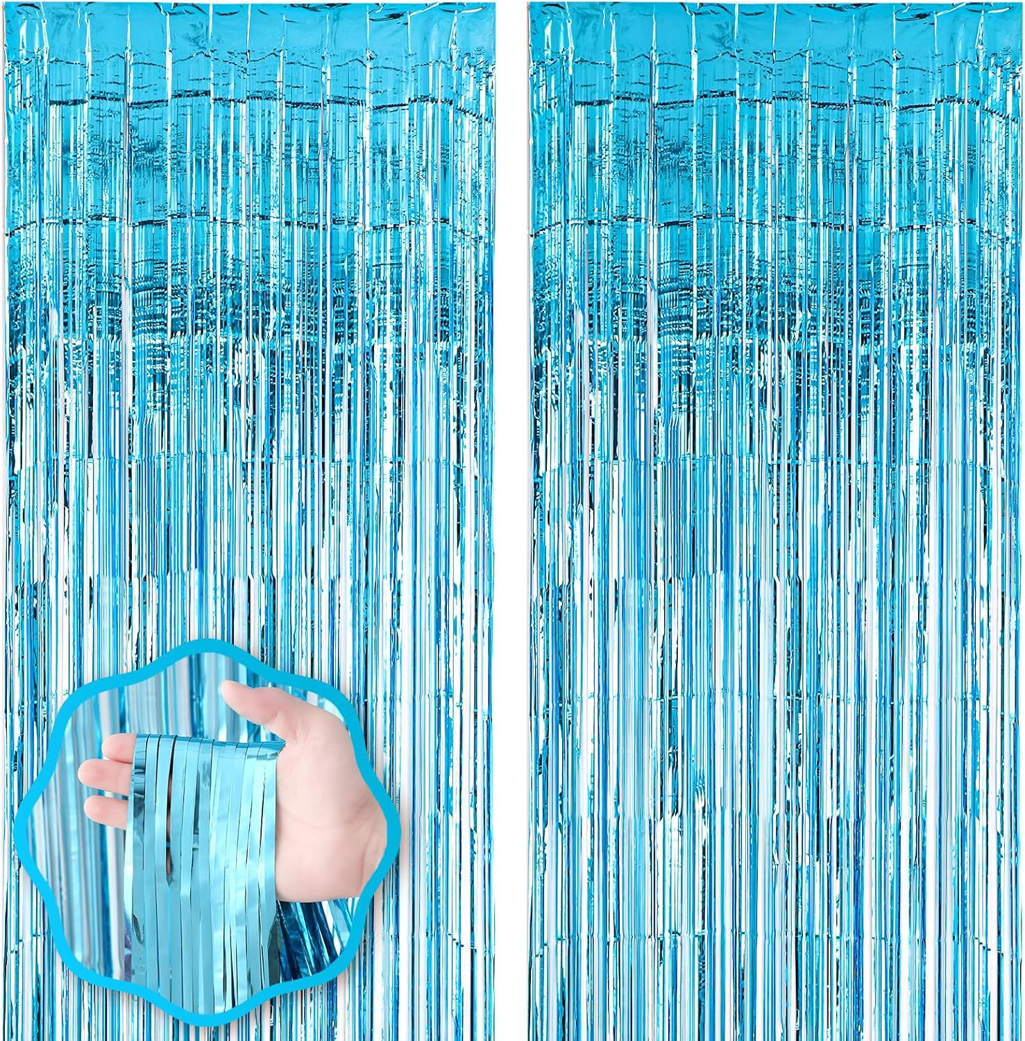 2 Pack 3.3x8.2 Feet Light Blue Foil Fringe Backdrop Curtains, Tinsel Streamers Birthday Party Decorations, Fringe Backdrop for Graduation, Baby Shower, Gender Reveal, Disco Party