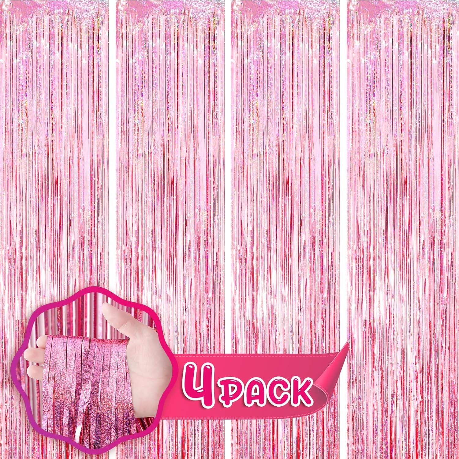 4 Pack 3.3x8.2 Feet Laser Pink Foil Fringe Backdrop Curtains, Tinsel Streamers Birthday Party Decorations, Fringe Backdrop for Graduation, Baby Shower, Gender Reveal, Disco Party