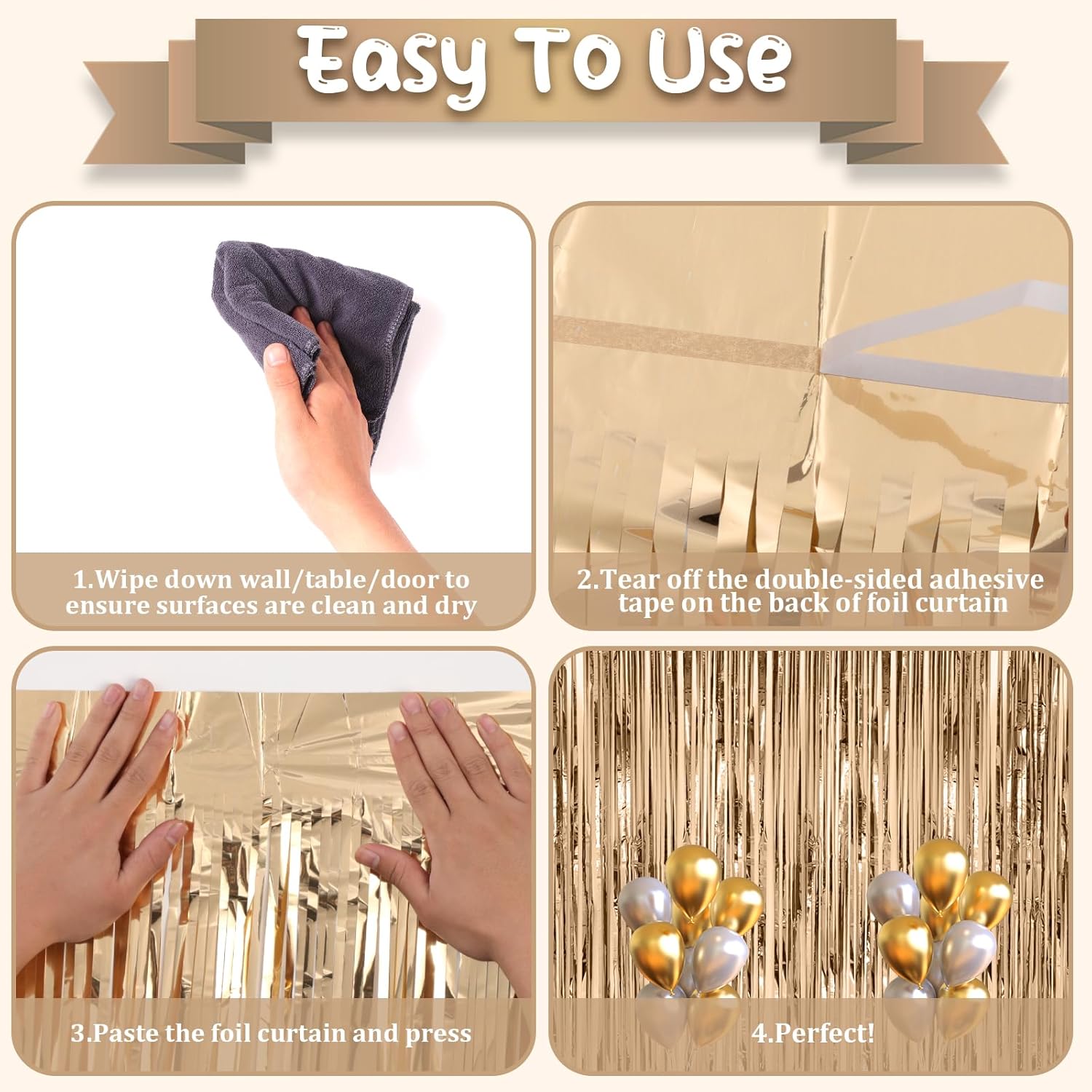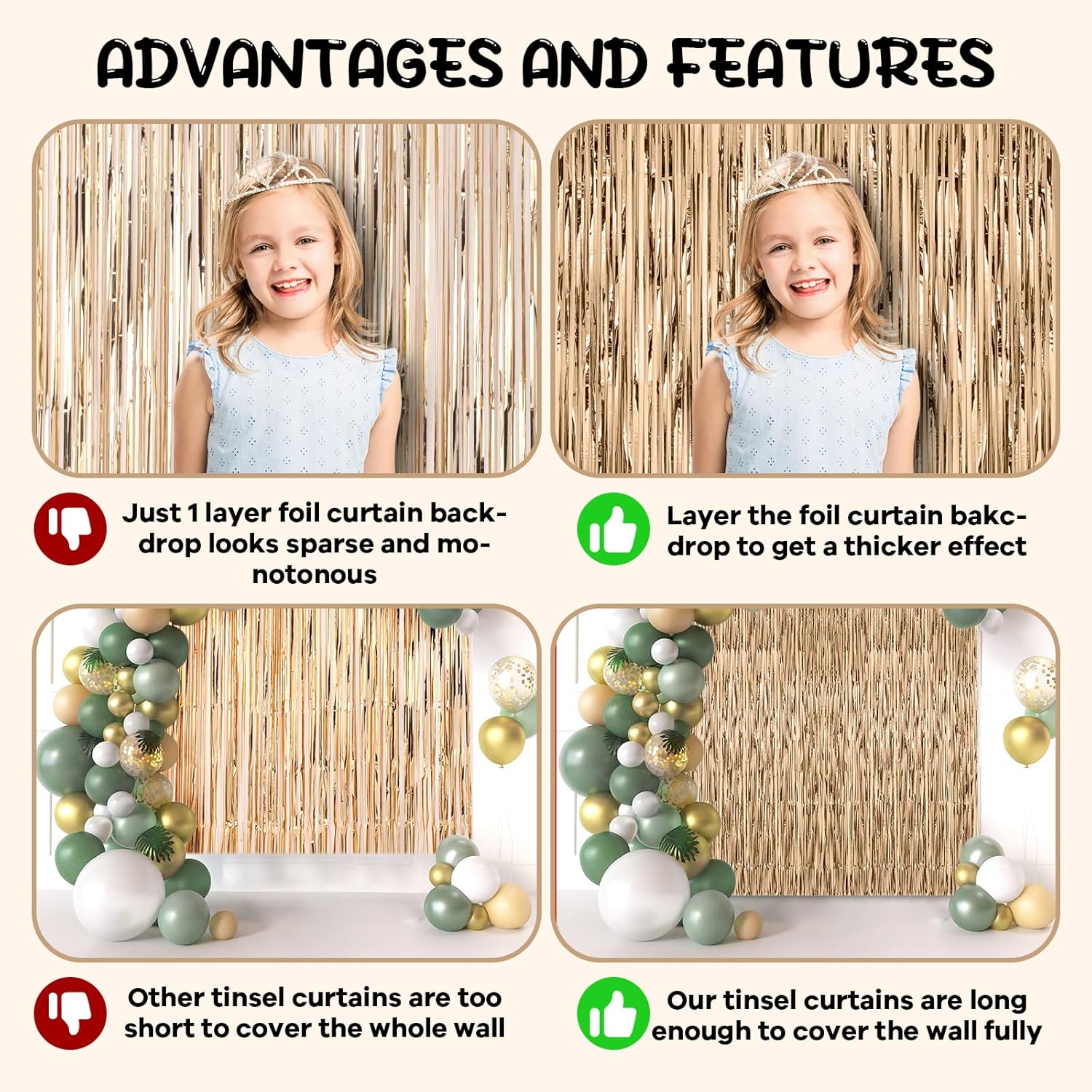 • Premium Material: This champagne foil curtain backdrop is made of stable tinsel, non-fading, stay shiny and reusable. Unfold it and then enjoy your glittering party
