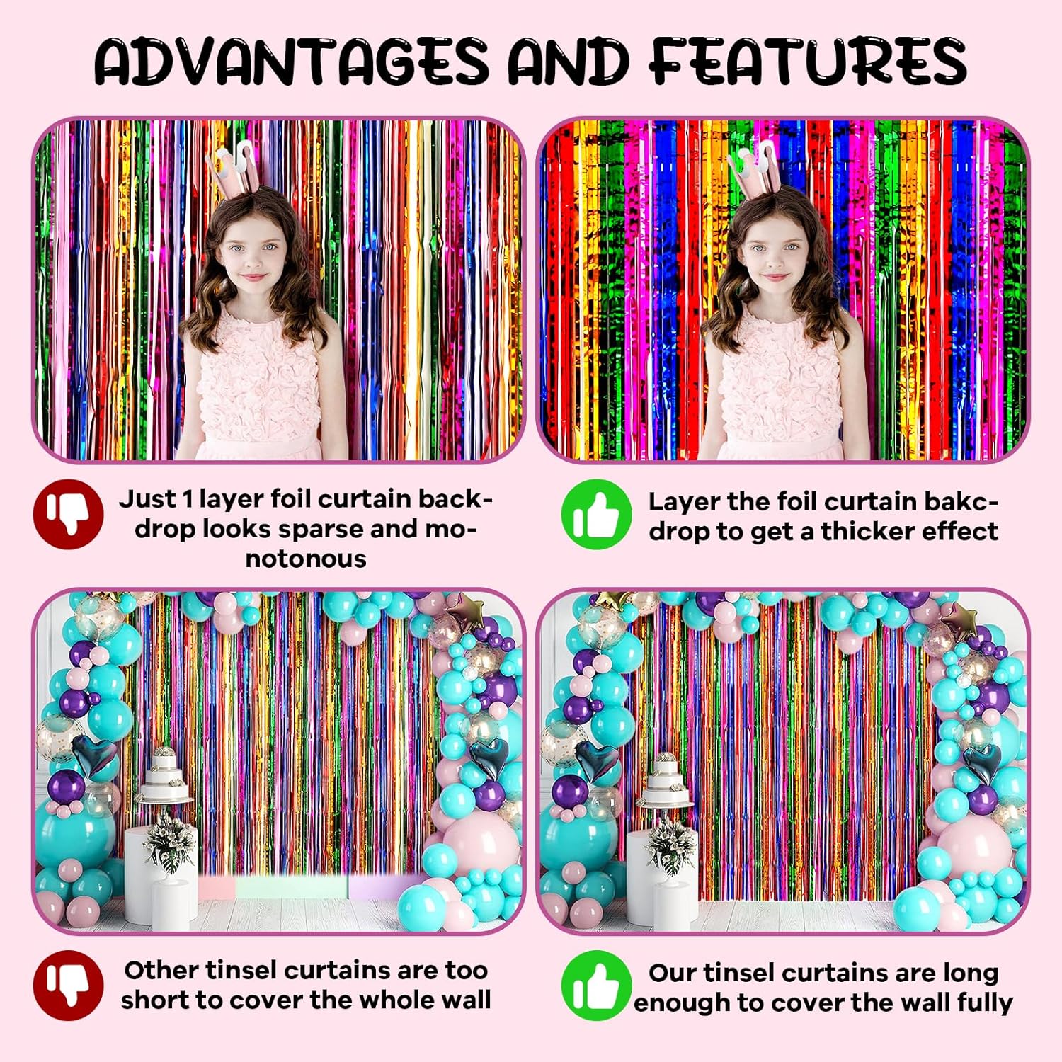 • Eye-Catching Design: These tinsel backdrops boast vibrant colors and a shimmering effect that reflects light beautifully. Your friends will be mesmerized by the captivating atmosphere these curtains create