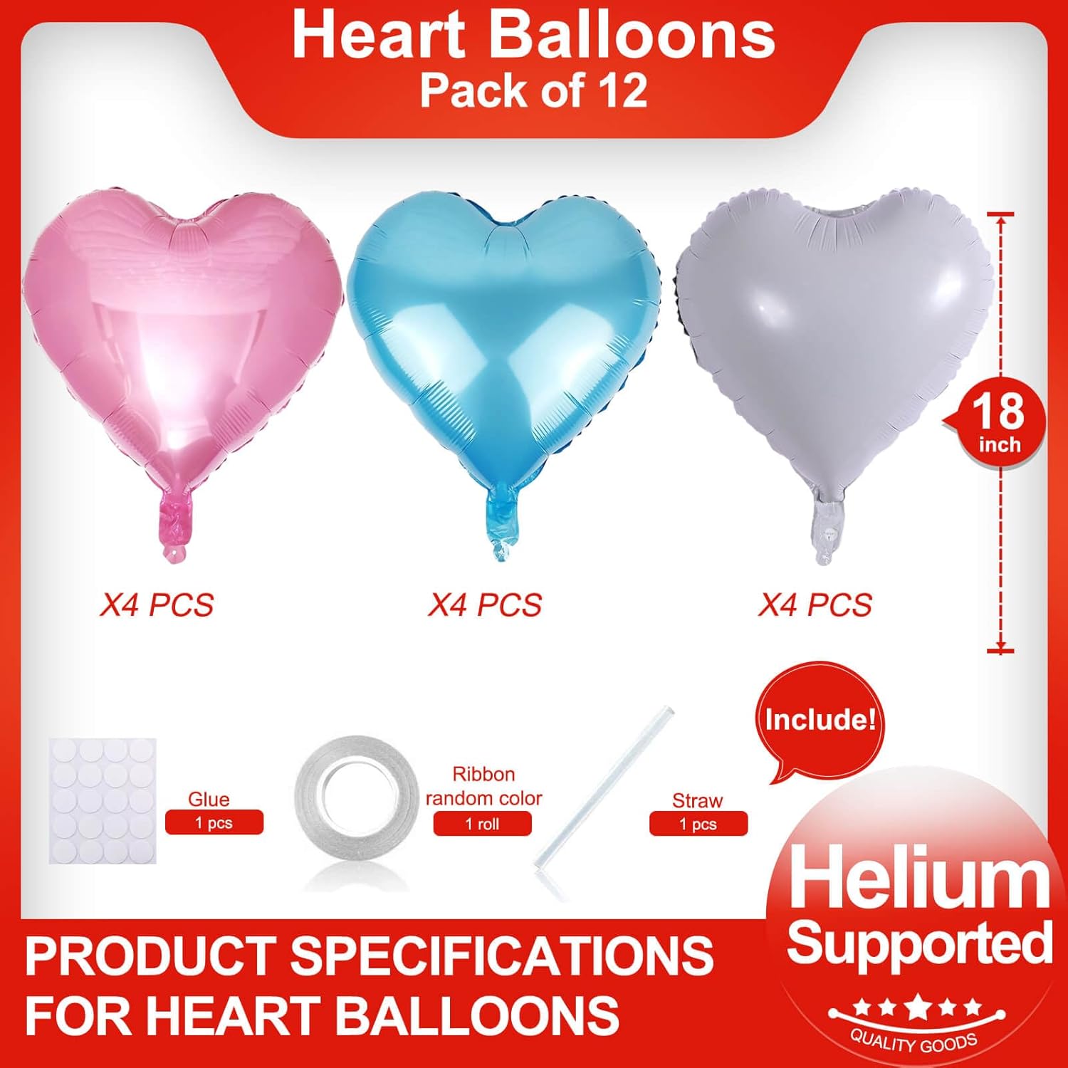 • Package Included:12Pcs (Pink*4+White*4+Blue*4)18 inch Heart Balloons (uninflated) + 1pcs Straw +1pcs 32 foot Ribbon Roll+20 Dots Glue