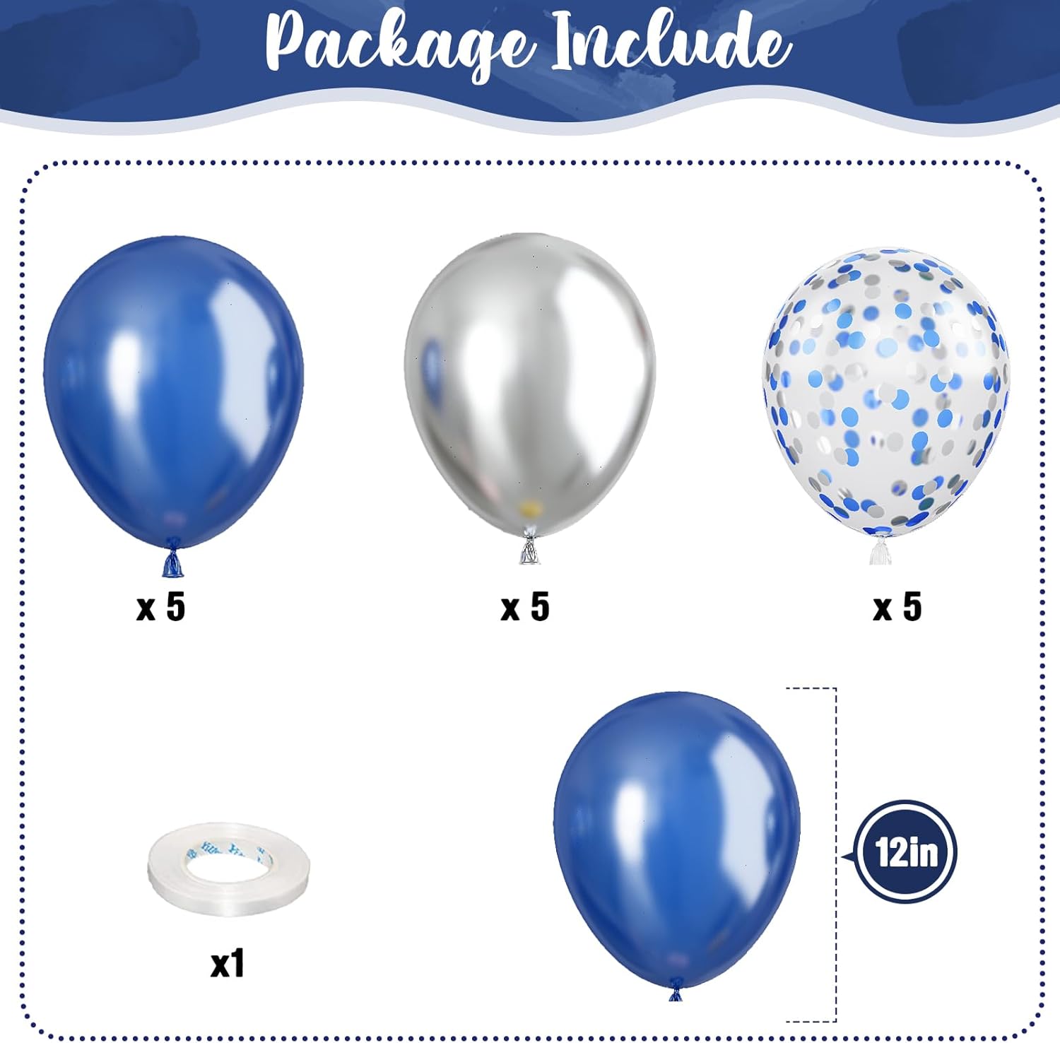 • πŸŽ‰ Navy Blue Silver Balloons - You will get 35 pieces 12 inch latex party balloons set, includes pearl navy blue 15pcs, metallic silver 10pcs, blue silver confetti 10pcs, come with 1pc white balloon ribbon. Perfect for women men birthday baby bridal shower wedding new year party decorations supplies.