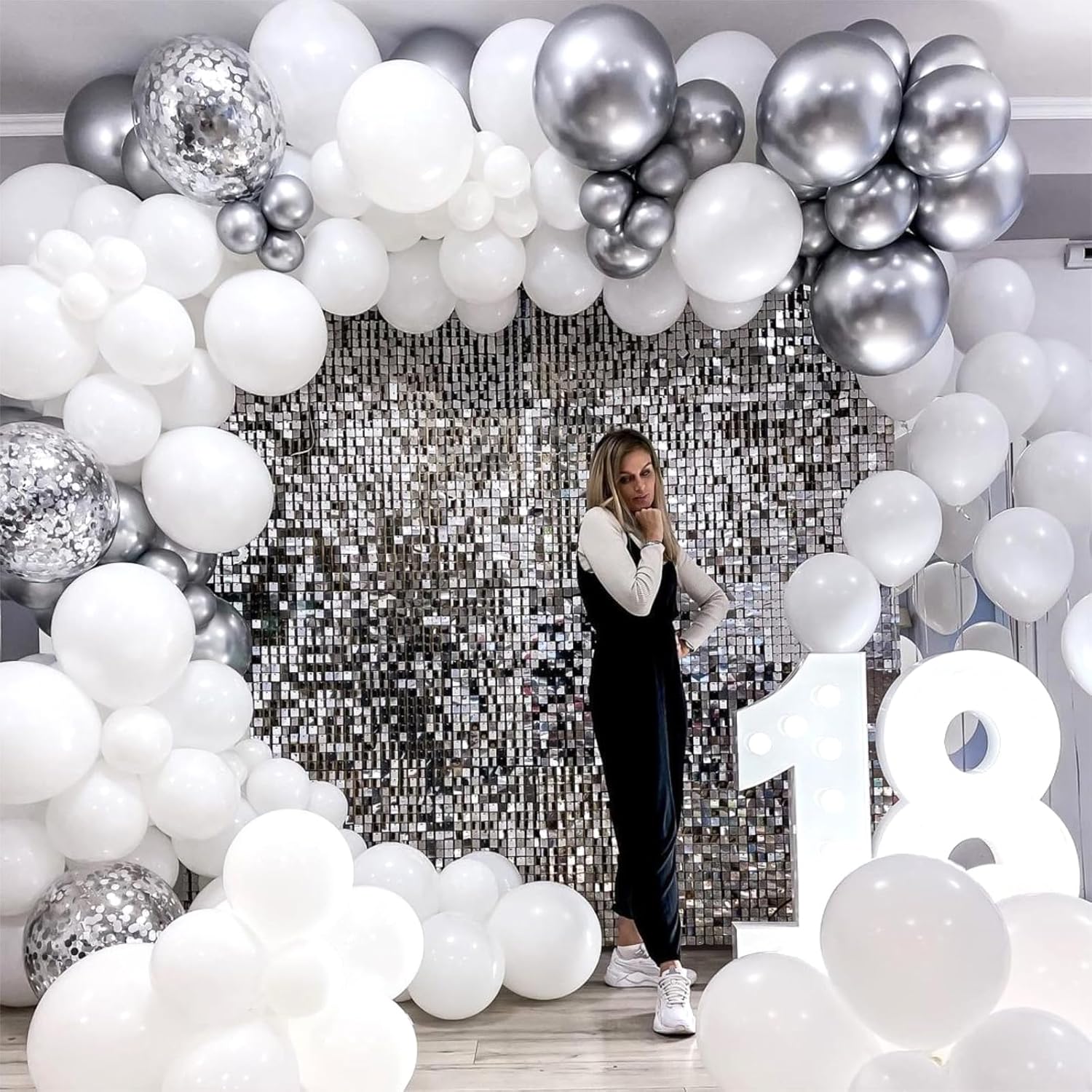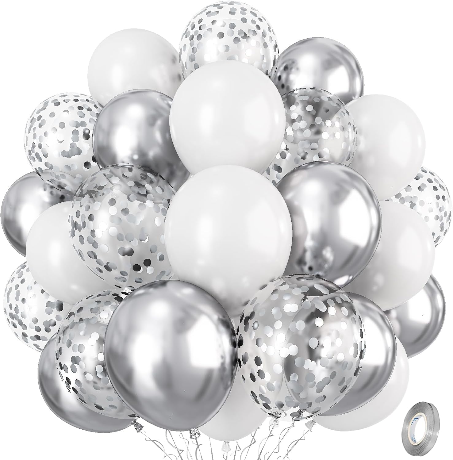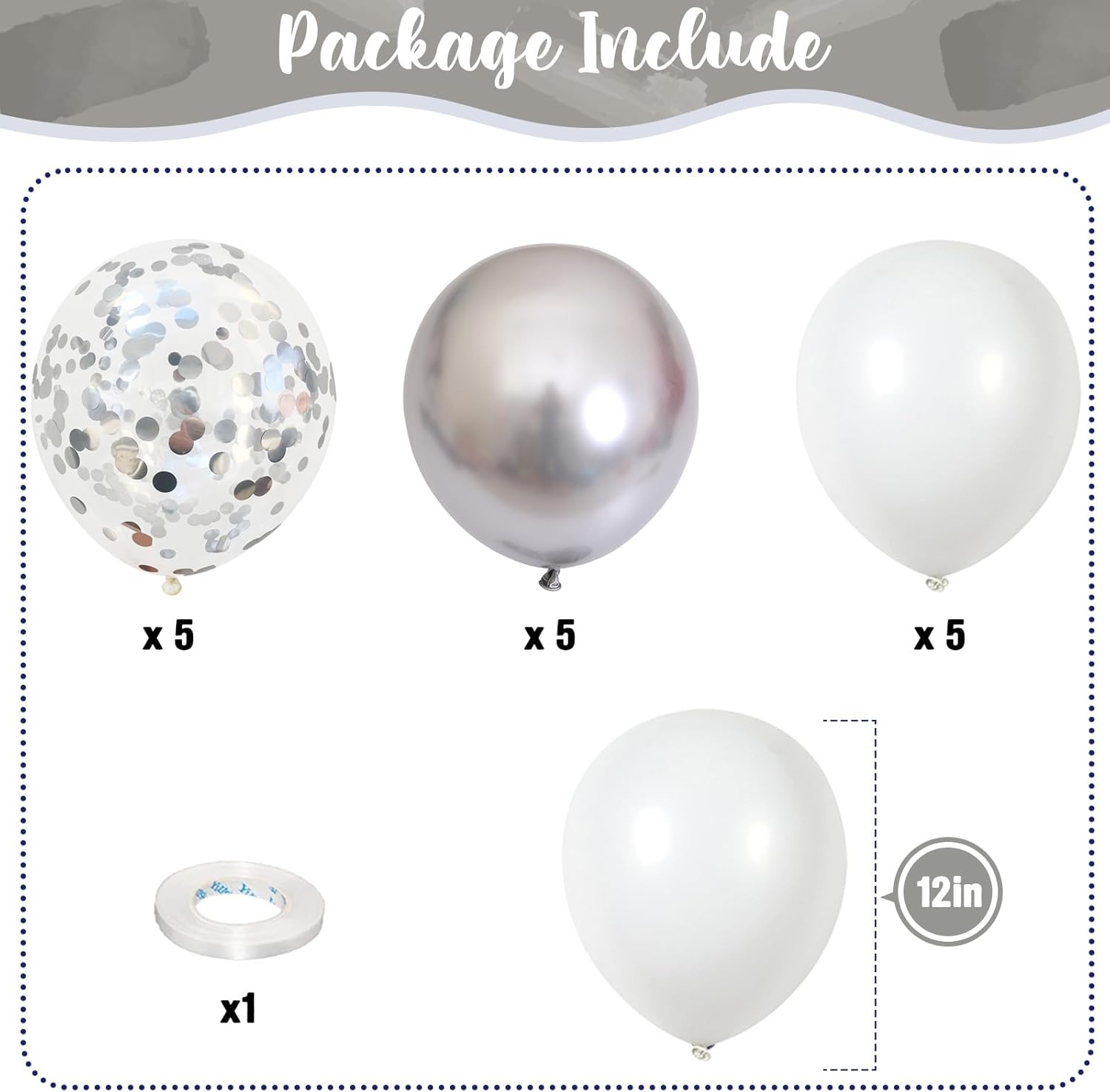 • πŸŽ‰ Silver White Balloons - You will get 35 pieces 12 inch latex party balloons set, includes white 15pcs, metallic silver 10pcs, silver confetti 10pcs, come with 1pc silver balloon ribbon. Perfect for women men birthday baby bridal shower wedding new year party decorations supplies.