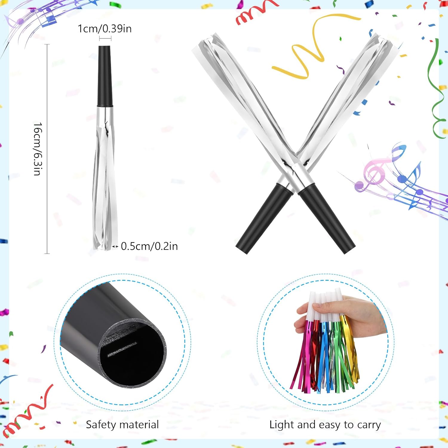 • Size: The party noisemakers are approximately 16 cm/6.3 inches long, making them small and lightweight. They are easy to carry and store, which makes them suitable for most children to hold comfortably.