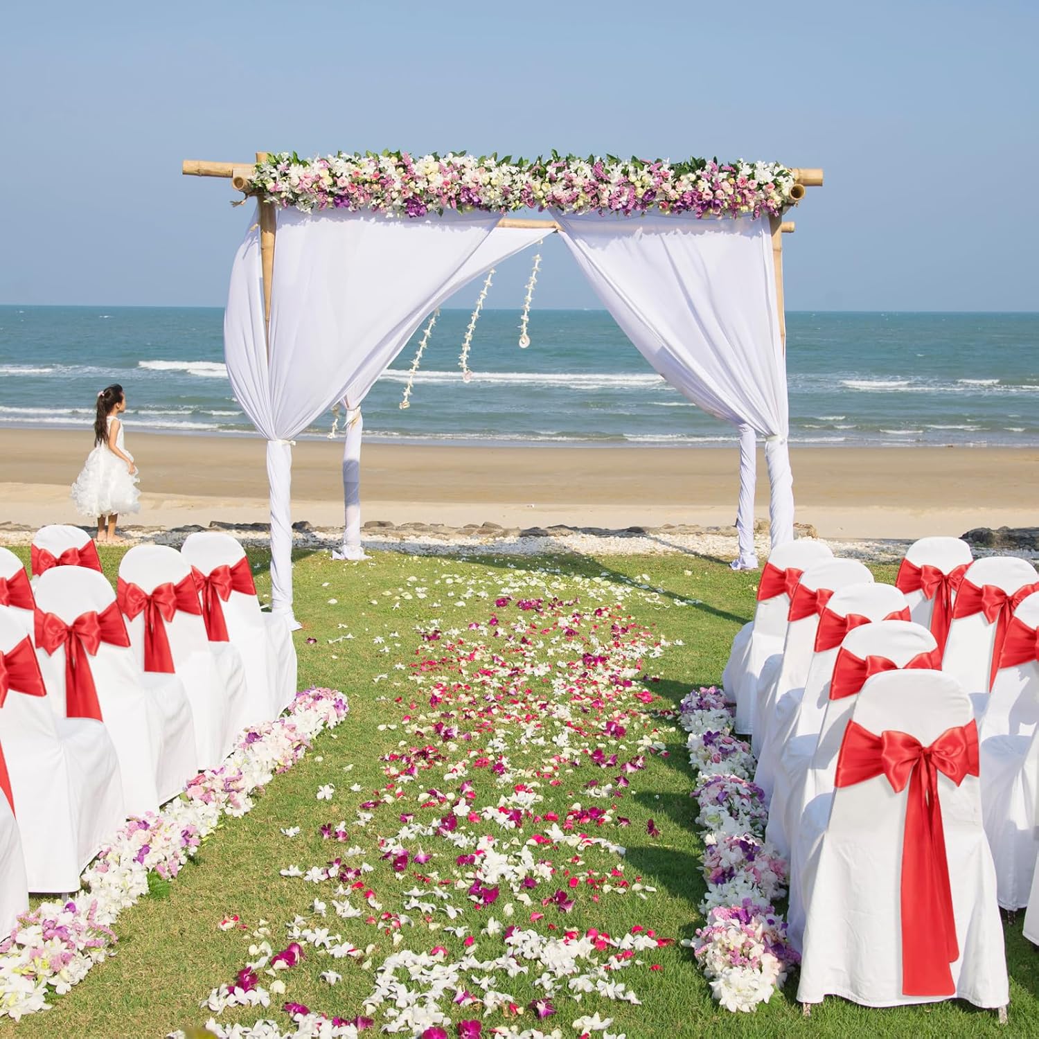 • Size & Package:You will get 50 pieces red satin chair sashes, and the size is about 108" x7" or 275cm(l) x 17cm(w). These chair ties adopt flating packing, please to tie the bow by yourself. Each package includes chair sashes only, no chair covers