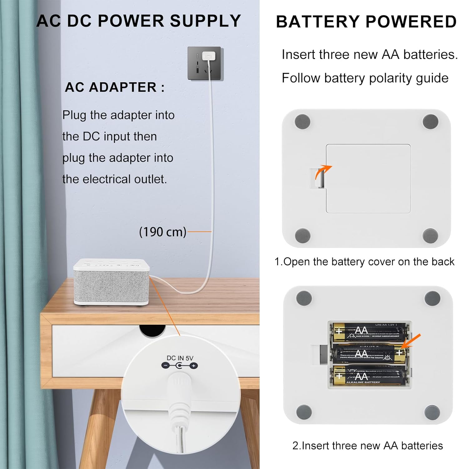 • [Plug in or Use battery for White Sounds Machine] – The sleep noise machine is powered by an included AC adapter with a micro USB cable or 3 AA batteries (Not included), making it an easy portable solution for home, office and travel.