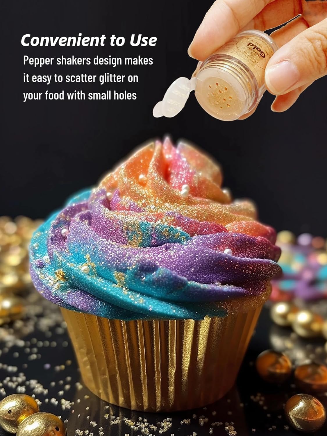 • 【Ideal Cake Decorating Supplies Glitter and Multi Using】Edible prism powder is food-grade shimmer disco edible glitter is approved for both food and drink consumption,so is great to use for drinks, beverages, cocktails, and suitable for fondant, cakes pop , cookies, cupcakes, cake decorating, macaron, icing cream, and other gourmet baked goods, glossy glitter cake topper for desserts, metal finish, chocolate, strawberries, pull candy/isomaltose, etc.,
