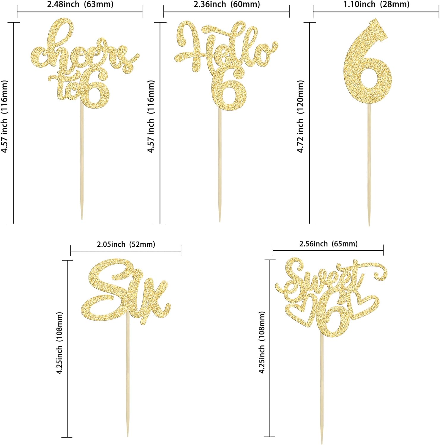 30Pcs 6th Birthday Cupcake Toppers Glitter Six Hello 6 Cupcake Picks Cheers to 6 Years Old Cake Decorations for 6th Birthday Party Supplies Gold