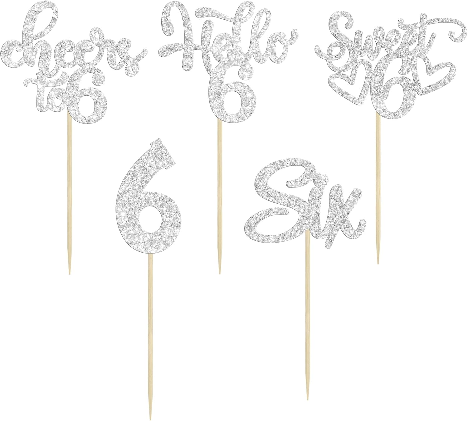 30Pcs 6th Birthday Cupcake Toppers Glitter Six Hello 6 Cupcake Picks Cheers to 6 Years Old Cake Decorations for 6th Birthday Party Supplies Silver