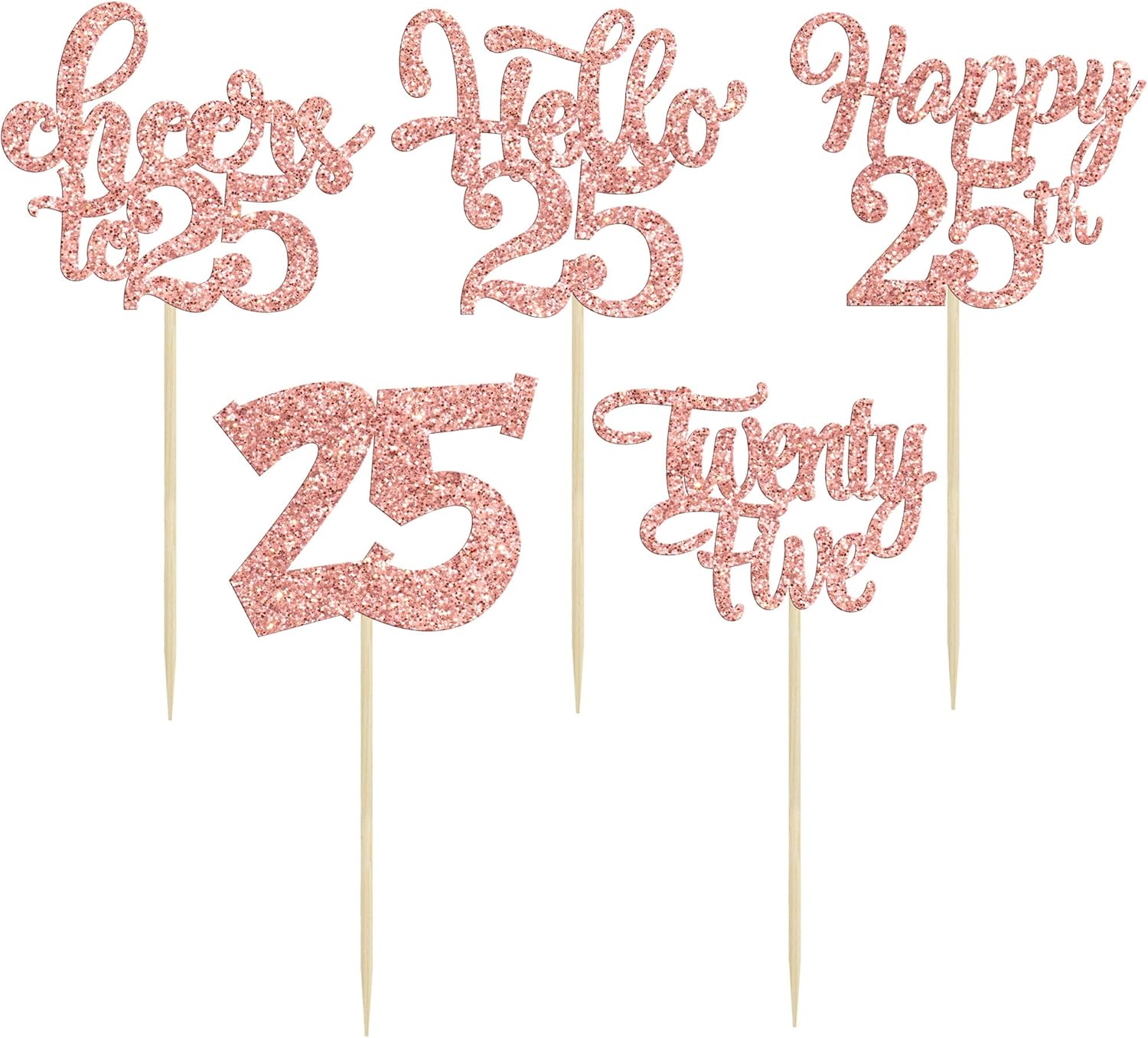 30pcs 25th Birthday Cupcake Toppers - 25th Anniversary Cake Decorations - Rose Gold Glitter