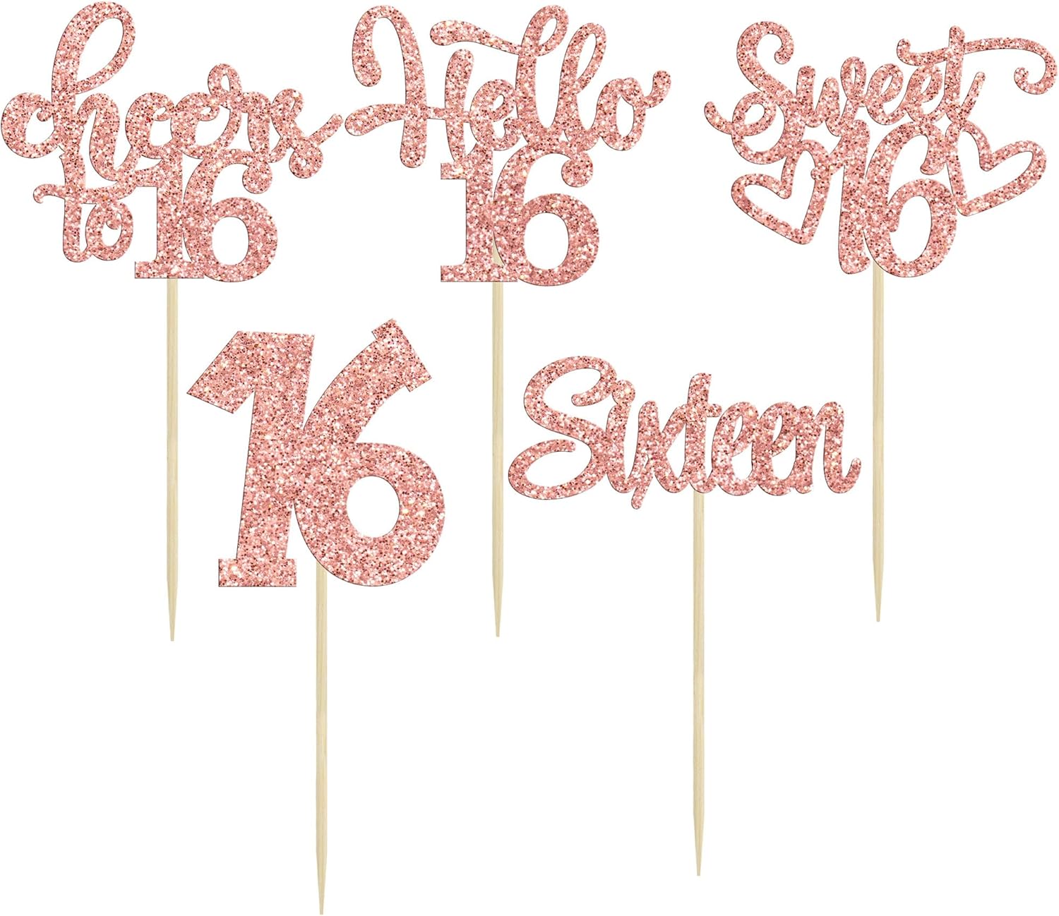 30pcs 16th Birthday Cupcake Toppers - Sixteen Happy Cupcake Picks, Cheers to Sweet 16 Cake Decorations in Rose Gold Glitter