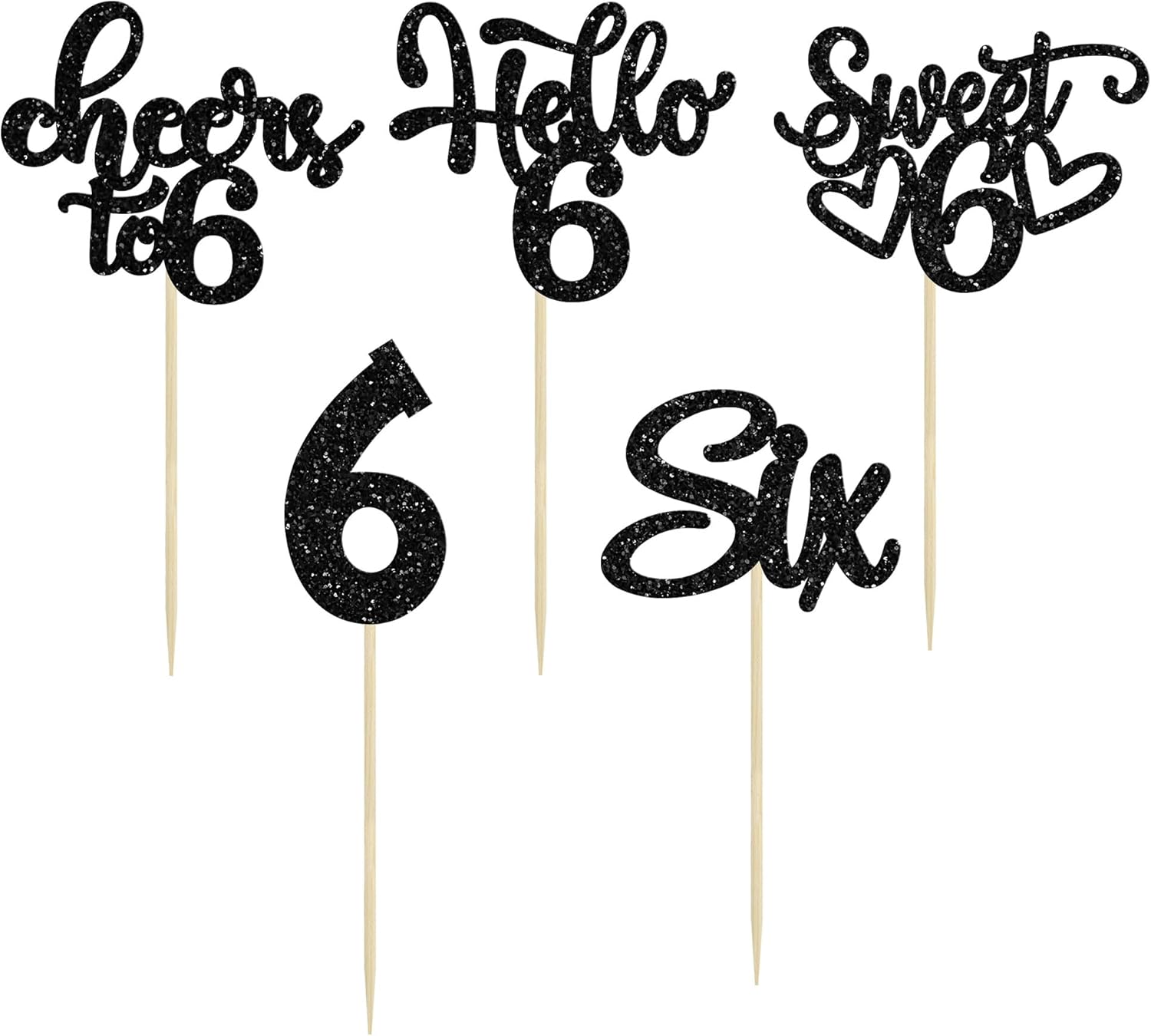 30Pcs 6th Birthday Cupcake Toppers Glitter Six Hello 6 Cupcake Picks Cheers to 6 Years Old Cake Decorations for 6th Birthday Party Supplies Black