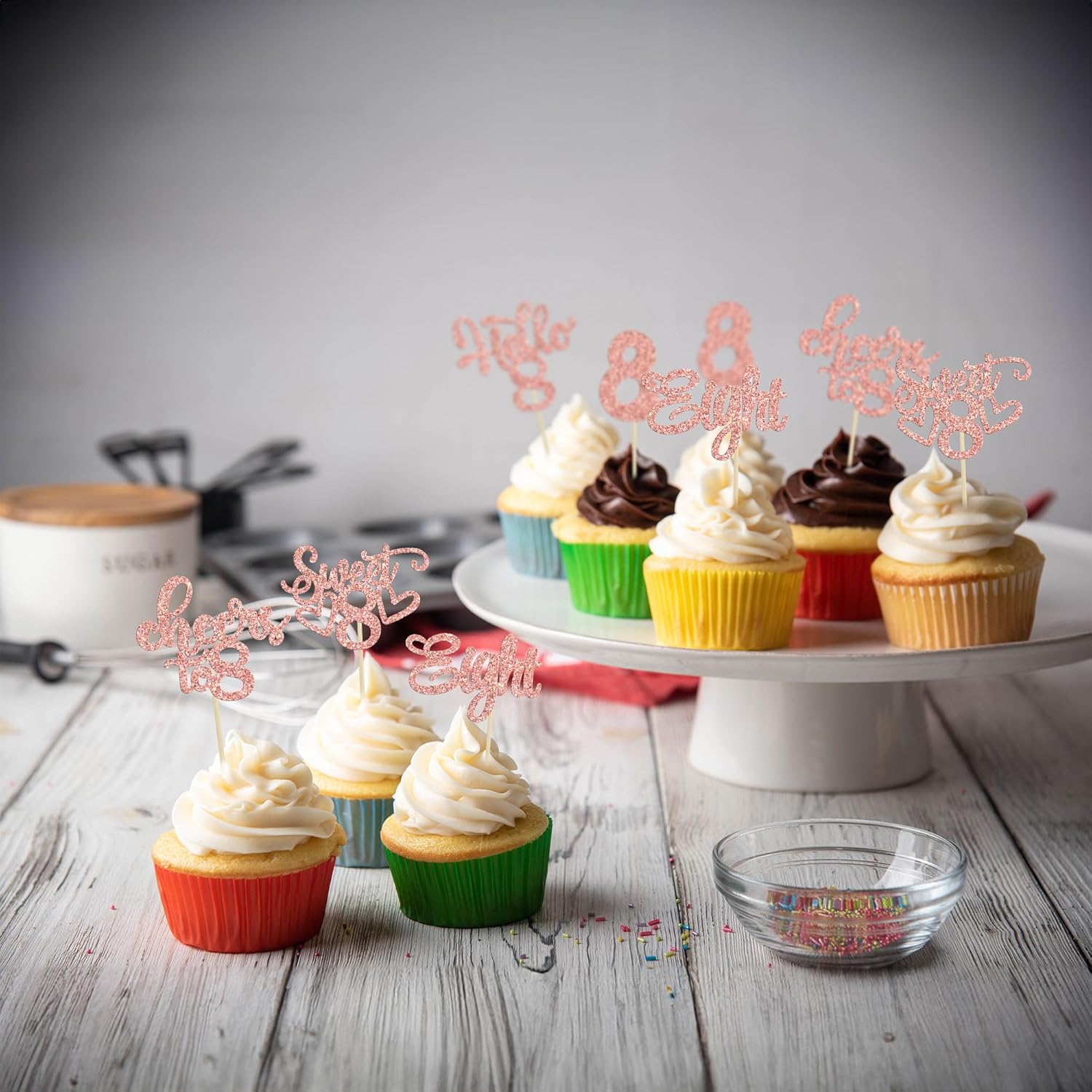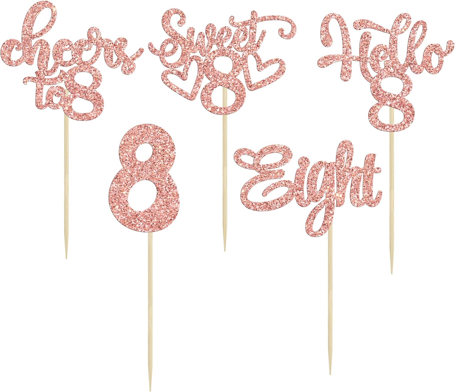 30Pcs 8th Birthday Cupcake Toppers Glitter Eight Hello 8 Cupcake Picks Cheers to 8 Years Old Cake Decorations for 8th Birthday Party Supplies Rose Gold