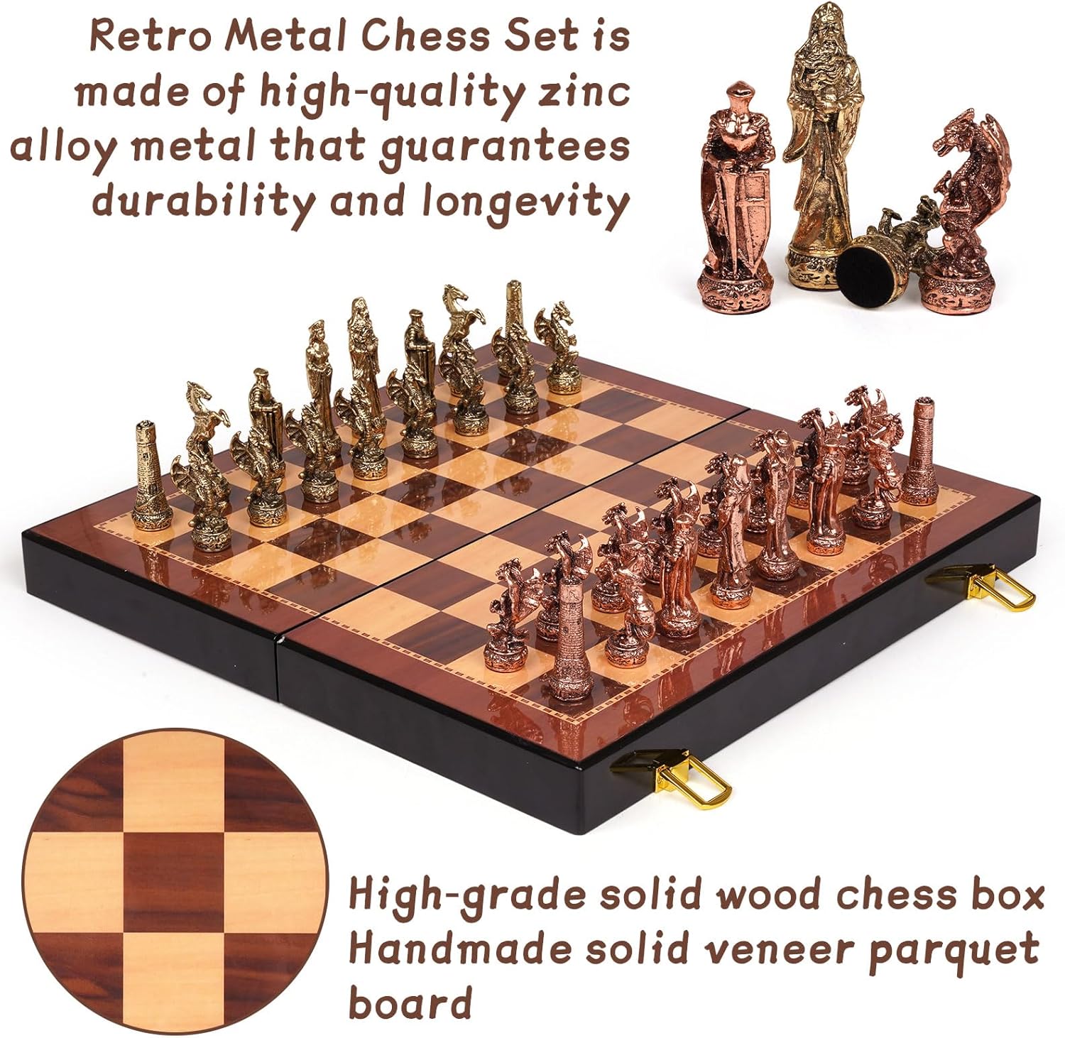 • Exquisitely Detailed Chess Set with Vintage Figurine-Inspired Pieces: This chess set boasts a distinctive charm with its intricately crafted chess pieces, each fashioned from high-quality zinc alloy metal. The careful attention to detail not only enhances the set's visual appeal but also ensures that it stands the test of time, making it a prized addition to any chess enthusiast's collection.