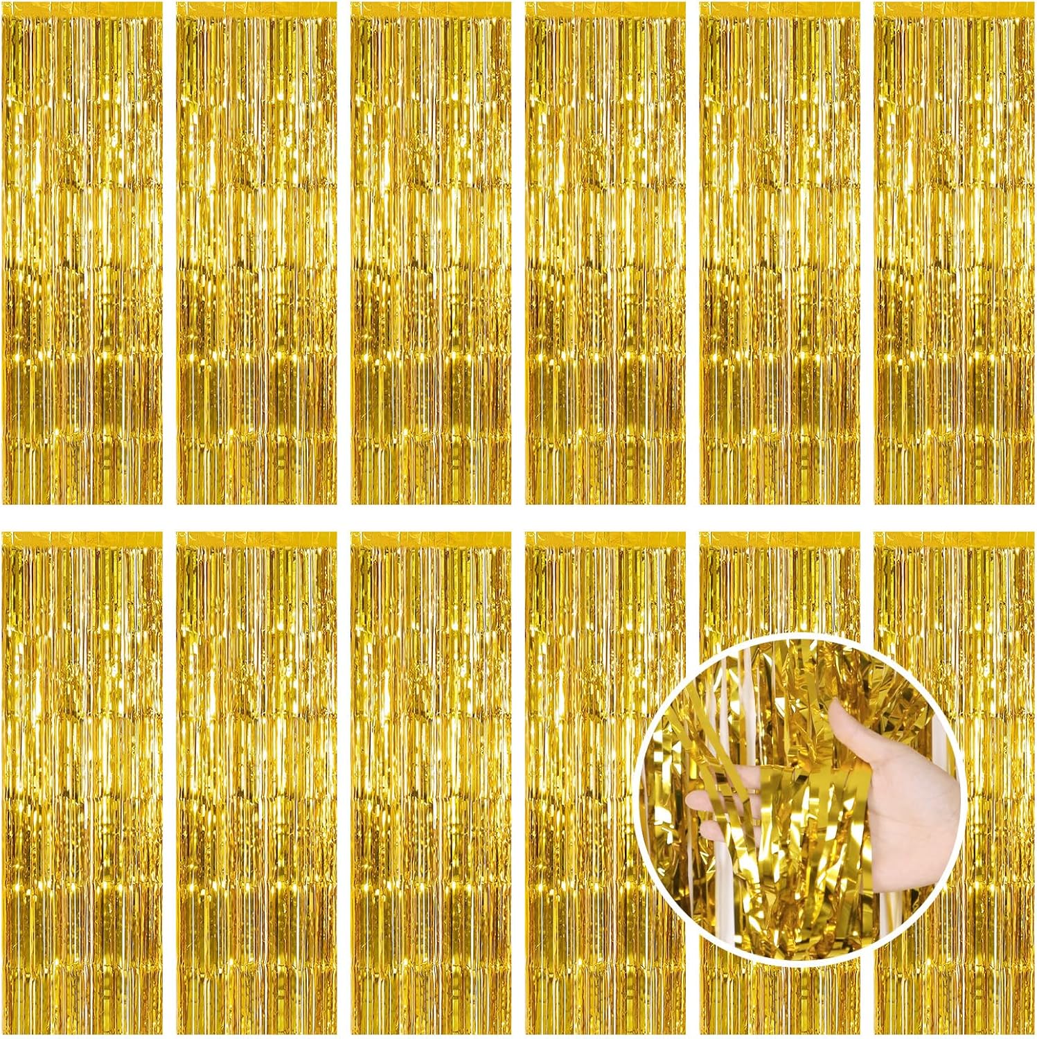 Gold Fringe Curtain Party Streamers, 12 Pack 3.3ft x 8.2ft Foil Curtain Backdrop Tinsel Foil Fringe Curtains Photo Booth Backdrop Streamer for Birthday, Wedding, Baby Shower, Disco Party