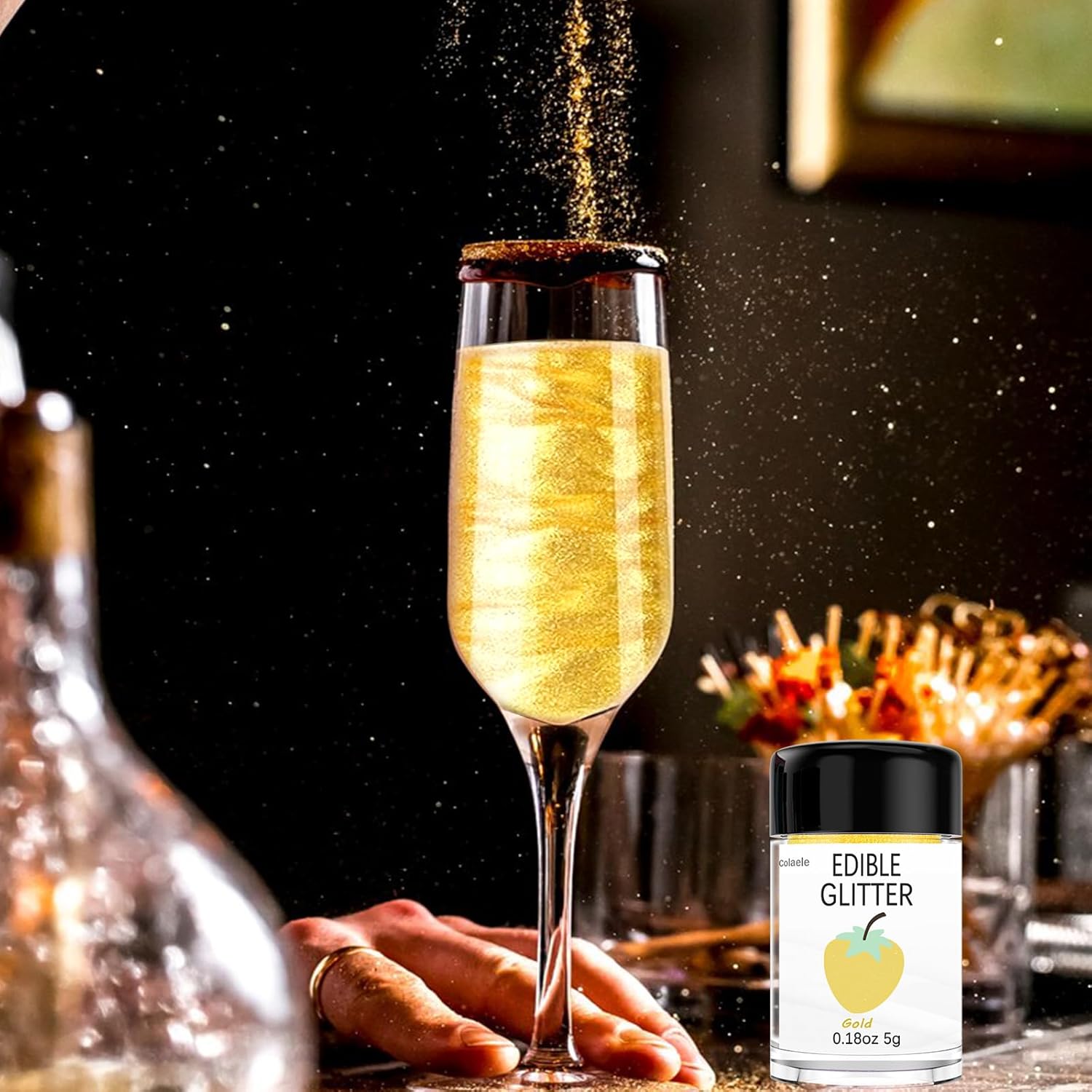 • Widely Used Edible Glossy Glitter for Desserts - Gold Shimmer disco edible glitter dust is great to use for strawberries, chocolates decoration, cookies, fondant, elevates cakes, cupcakes, cake topper, and other gourmet baked goods, metal finish, fudge/chewing gum, pull candy/isomaltose, etc., It is also suitable for parties drinks decorating, like champagne, beverages, cocktails, and more