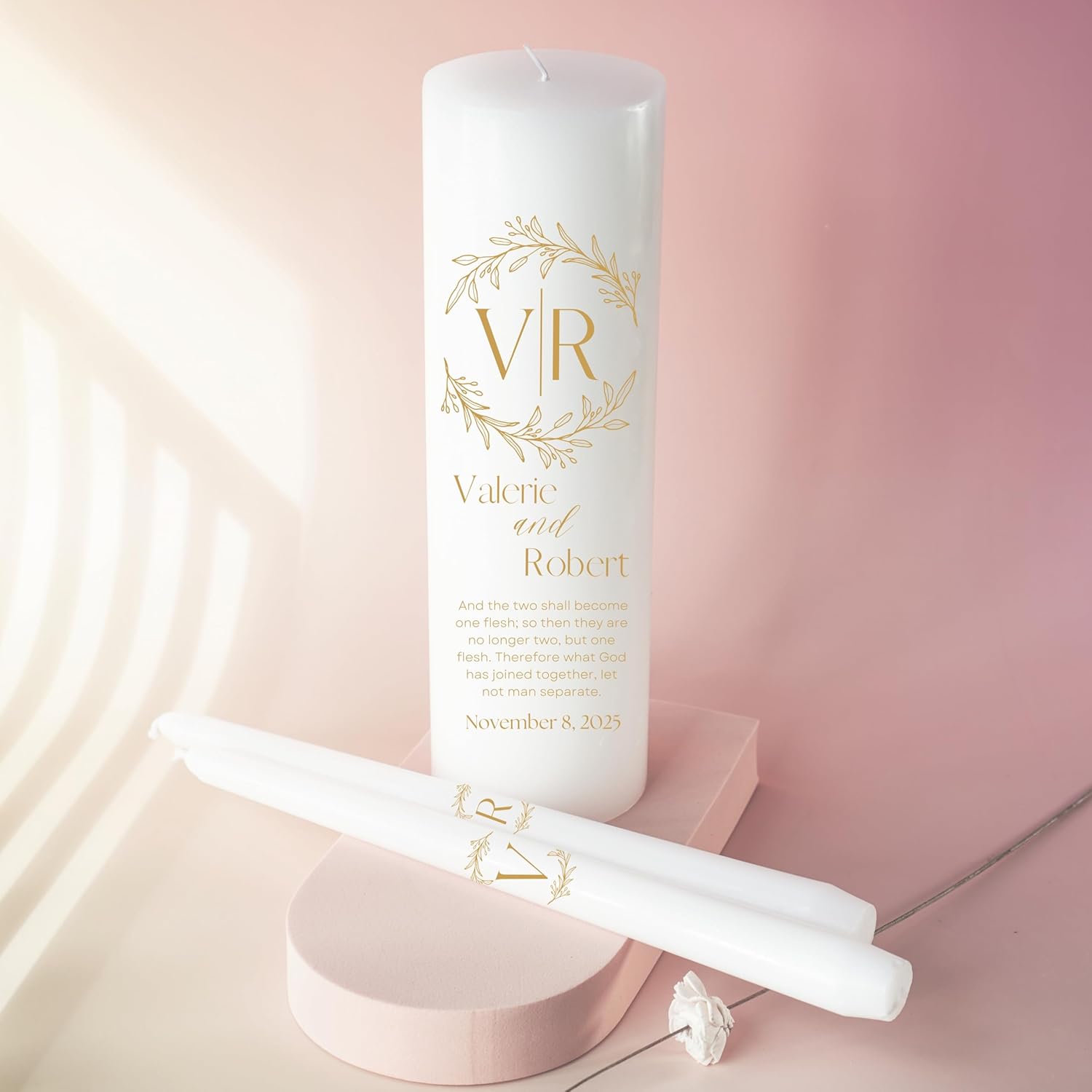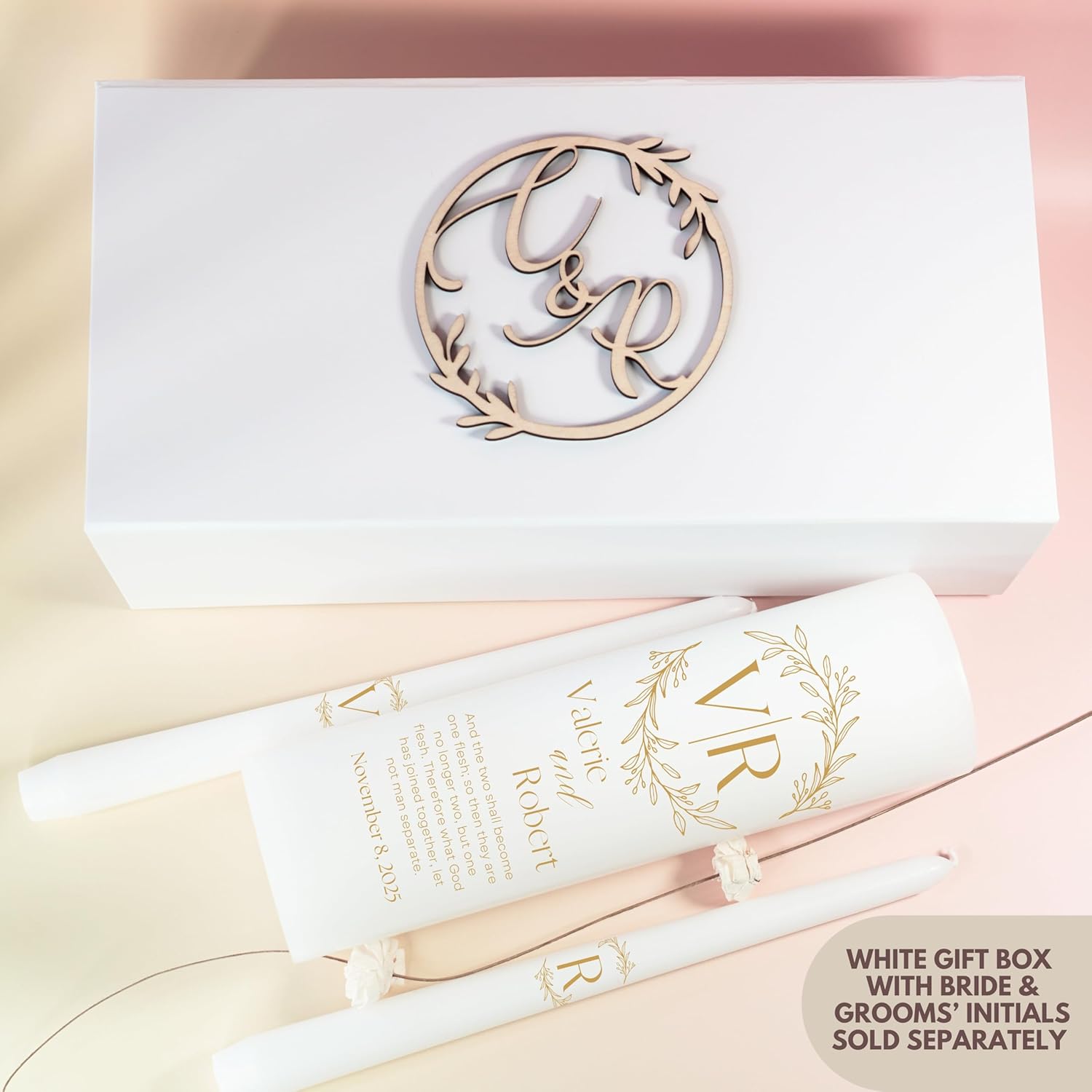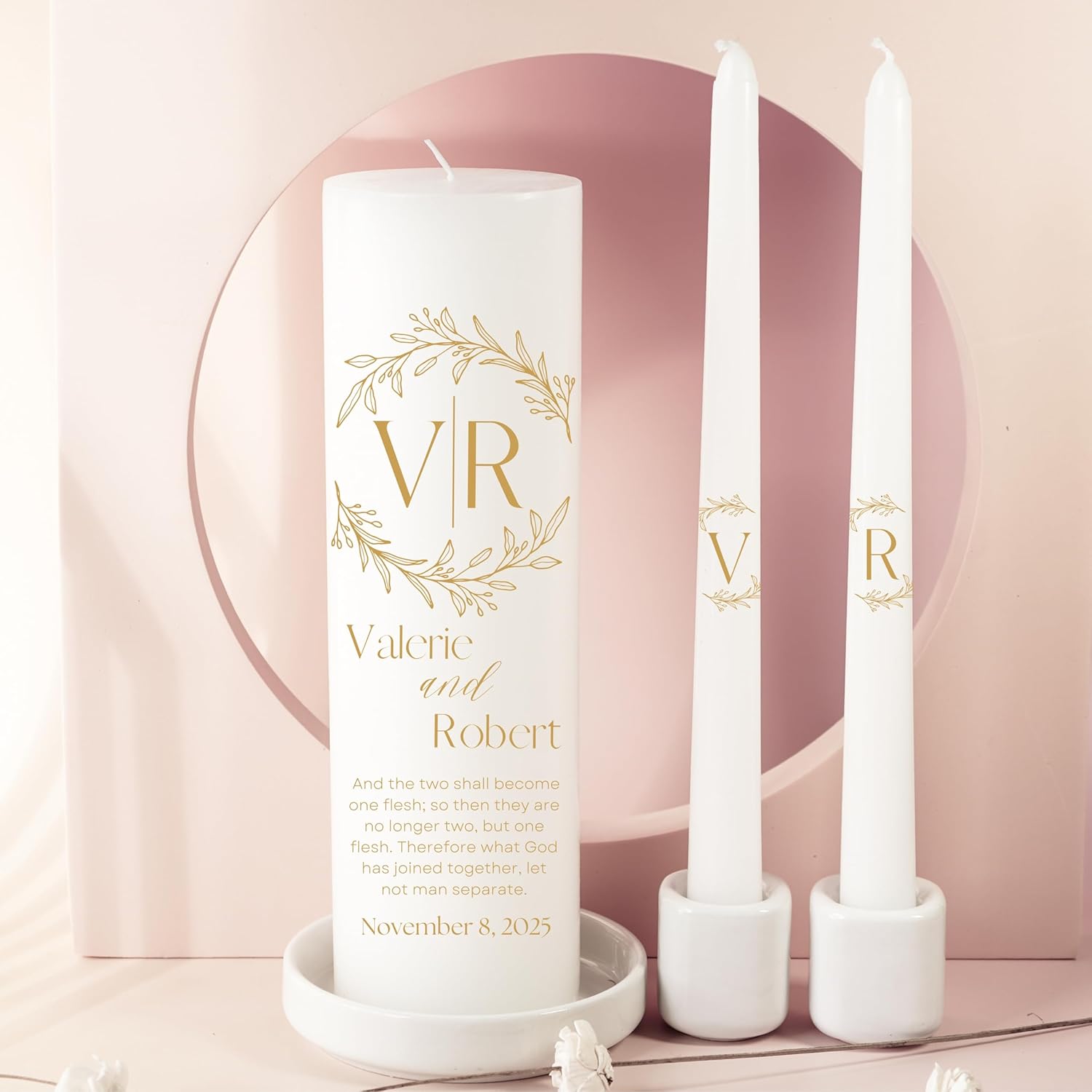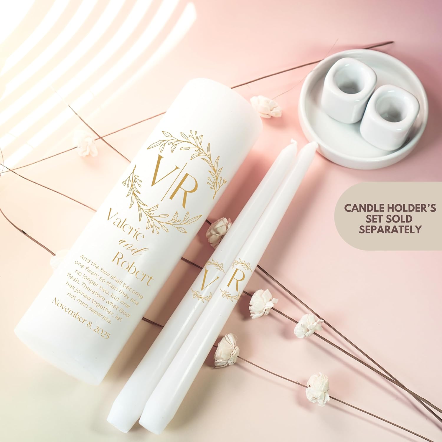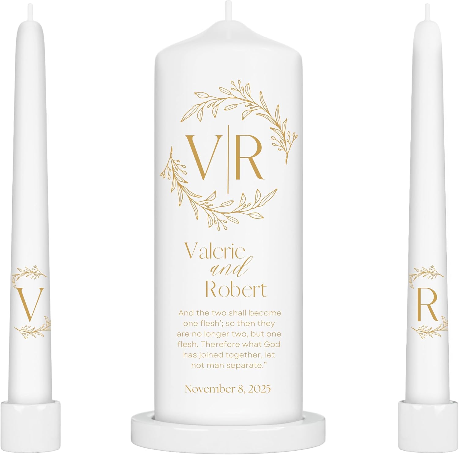 Unity Candles for Wedding, Modern Unity Set, Custom and Personalized Pillar and Taper Candles with Bible Quote, Unscented White Premium Wax, Religious and Wedding Ceremony, Special Events (Goldie)