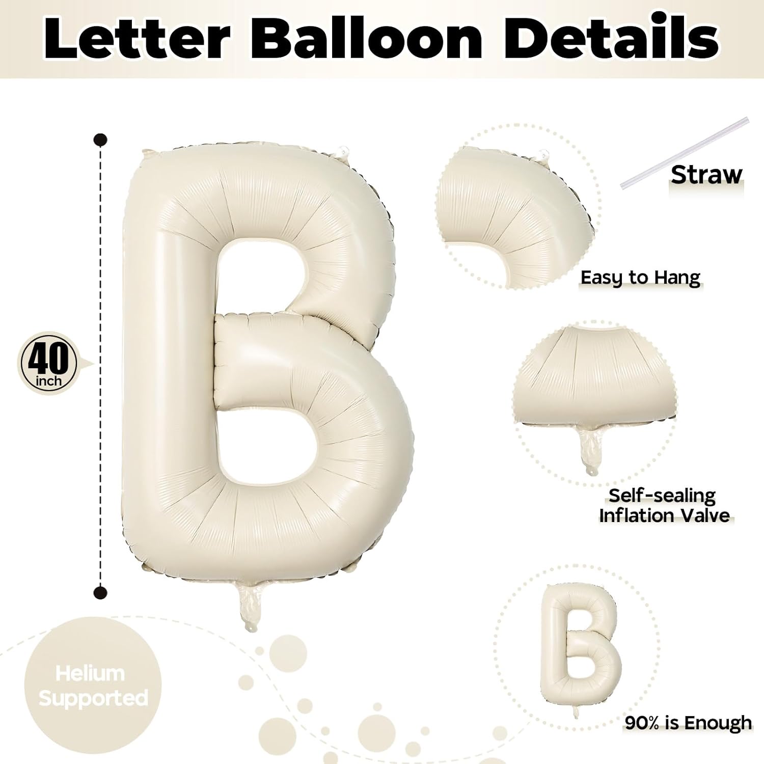 • 🎈 What You Get: Our product package includes 1pcs 40 inch "B" letter foil cream white balloon and 1pcs convenient straw for inflate. You can choose any big letter balloons to combine and customize the word you want to form. Make your party more unique and meaningful.