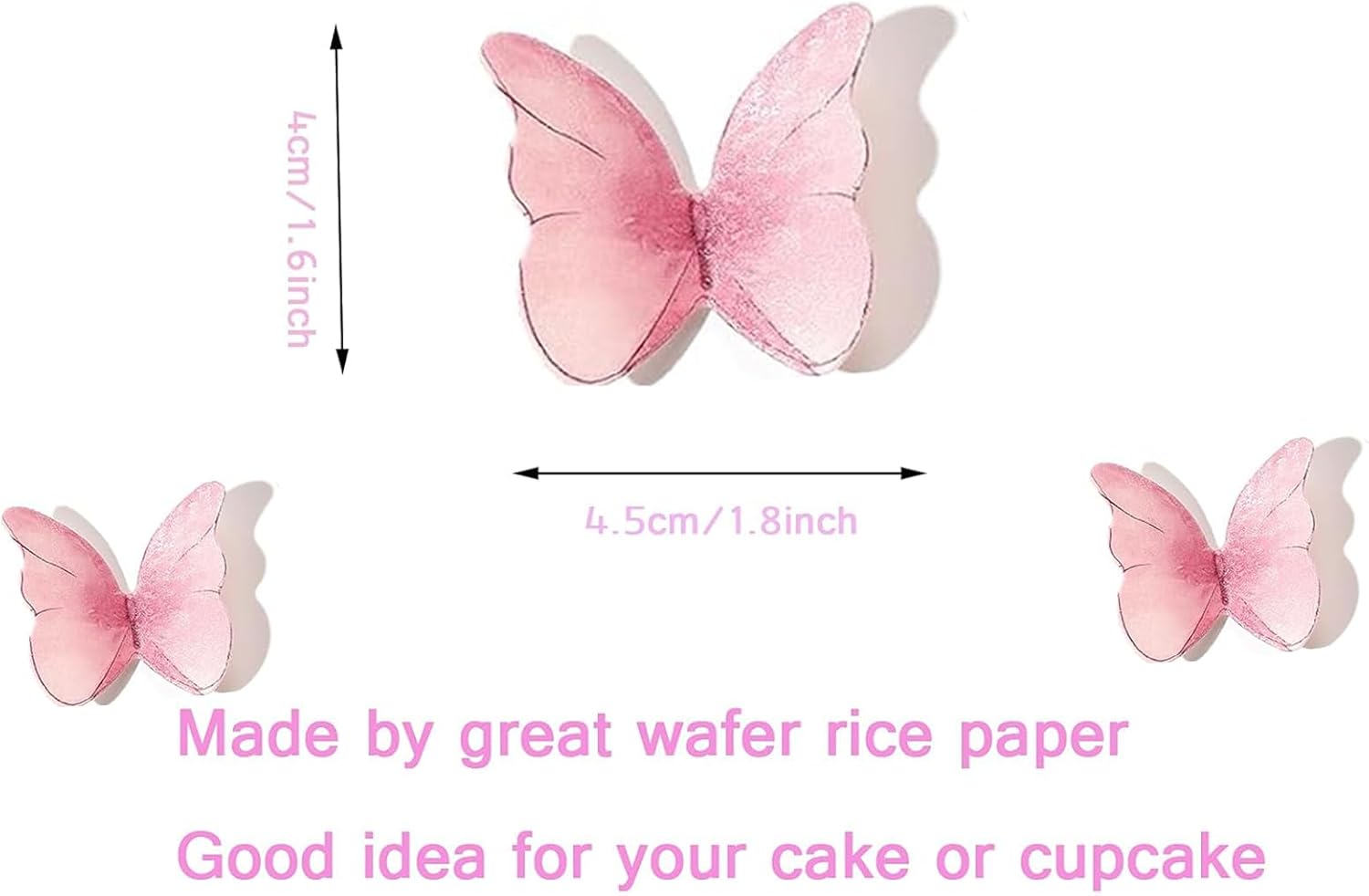 • Package:Edible wafer paper butterflies comes with 40pcs pink edible butterfly cake toppers, package with a box . It’s much convenient to storage and can be gift. Wing spans vary is about 1.9 inches