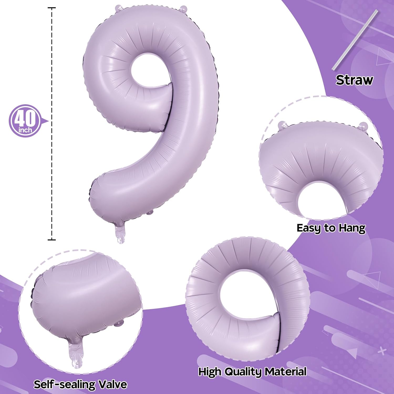 • ๐Ÿ’• Pastel Purple Number 9 Balloon ๐Ÿ’• - You will get 1pc 40 inch light purple mylar foil number 9 balloon and 1pc straw. Perfect for 9th 19th 29th 90th birthday or anniversary party decorations supplies.