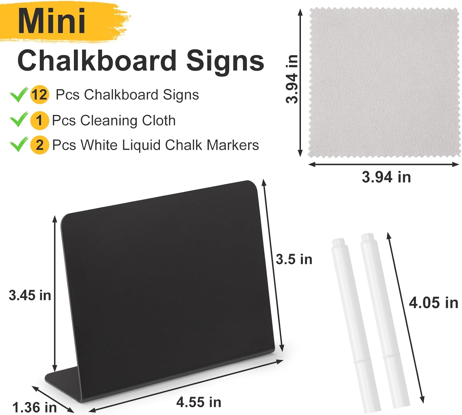 • Ideal Dimensions: The 12 pcs PVC mini chalkboard signs are all 4 in x 3 in, 2 pieces of liquid chalks are both 4 in x 0.4 in and 1piece of rag is 4 in x 4 in