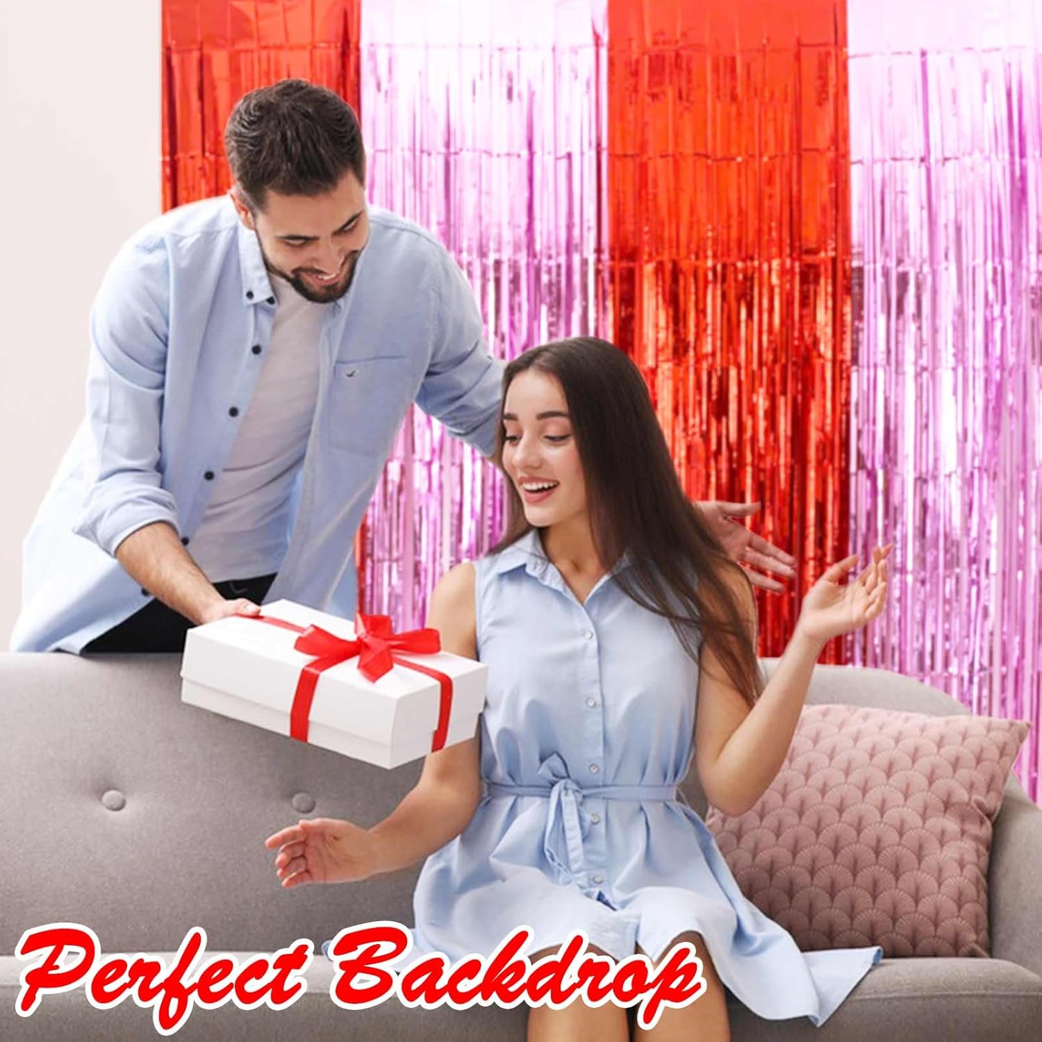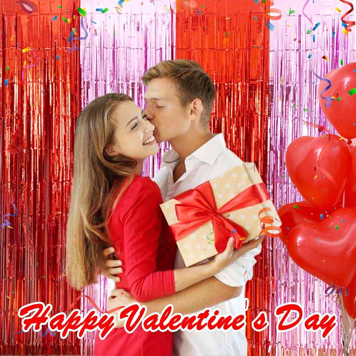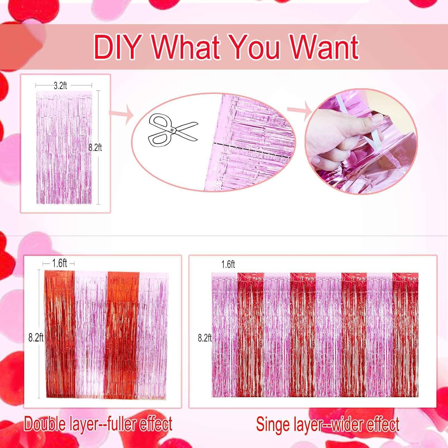 • EASY TO USE TINSEL BACKDROP: These foil fringe curtains are easy to install with only two steps - tear off the back of the double-sided adhesive tape and paste the foil curtain on the wall/door/table to decorate your Valentine's Day party