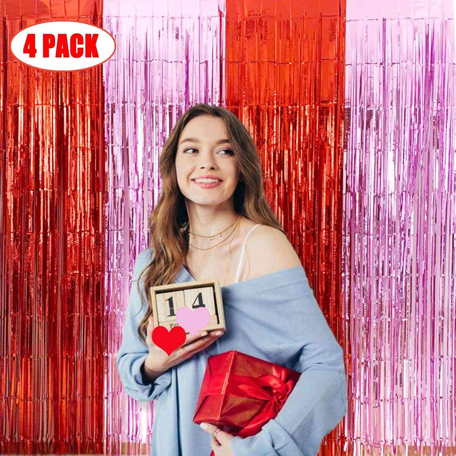 • RED PINK METALLIC TINSEL FOIL FRINGE CURTAINS: The package includes 4packs foil fringe backdrop curtains(2pack red +2pack pink), each metallic tinsel curtain is 3.2ft(wide)×8.2ft(drop), wonderful accessories for decorating doorway, window and walls. This stunning foil fringe curtain has a metallic finish that will add a touch of glamour to Valentine's Day party backdrop