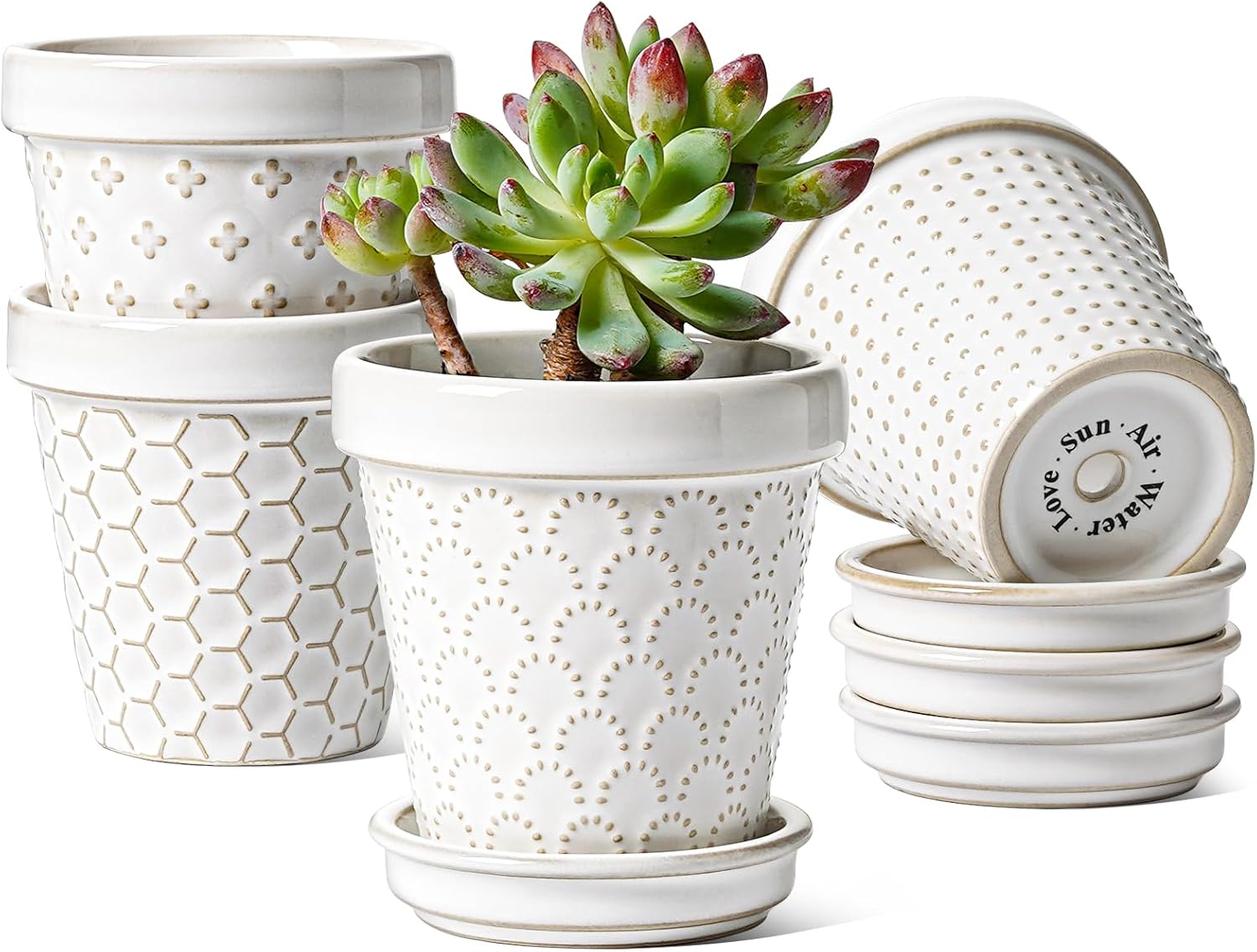 LE TAUCI 3 Inch Mini Succulent Pots - Very Small Ceramic Planter with Saucer, Tiny Embossed Flower Pots for Lithops, Mini Cactus, Air Plants, Fairy Gardens - Indoor Home Decor, Set of 4, Arctic White