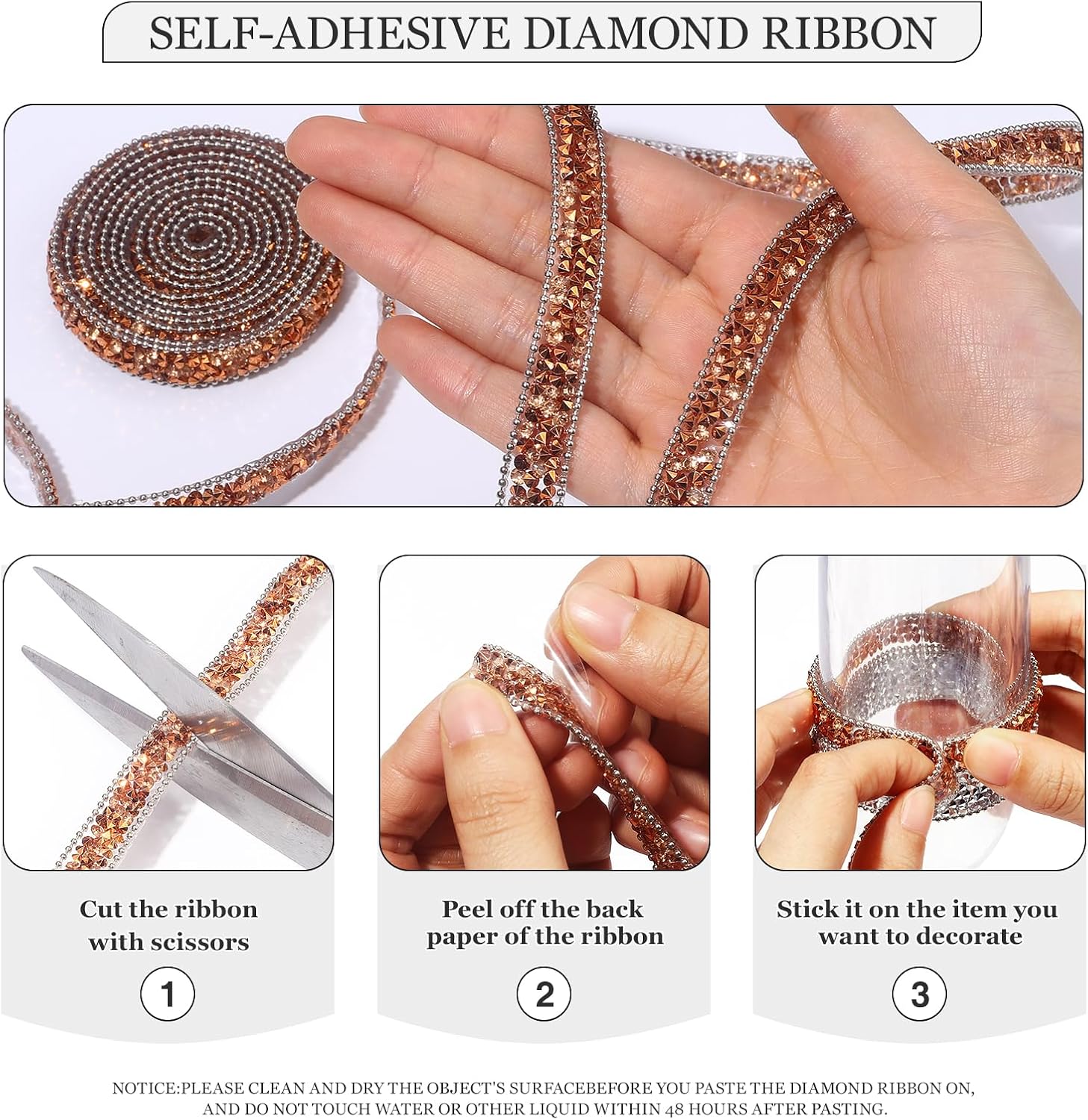 • Self-Adhesive Diamond Ribbon: The self-adhesive design with backing glue makes it possible to stick anywhere as long as the surface is smooth and clean. You cut the rhinestone ribbon into different lengths with scissors, then peel off the back paper of the sticker and paste it on the project you want to decorate.