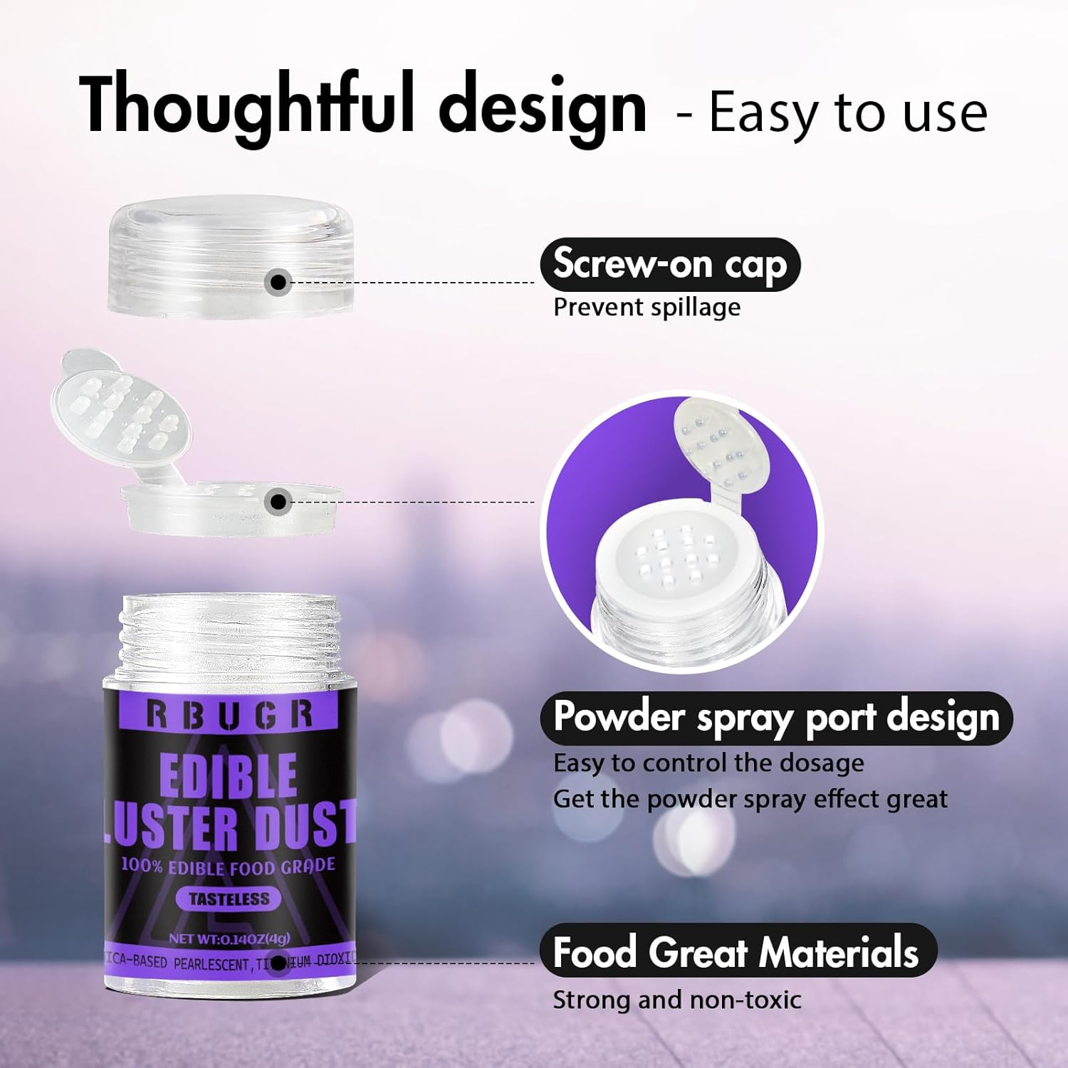 • Safe & Vegan: You can be assured that our drink glitter edible dust is safe, as they are made of 100% food-grade luster dust, No allergens, fat free, dairy free, gluten free, nut free, non genetically modified and non-toxic. So whether you are a vegetarian or allergy-prone, you can use these drink glitter without worry. Rbugr glitter powders has excellent adhesion on both wet and dry media, they have good coloring effects