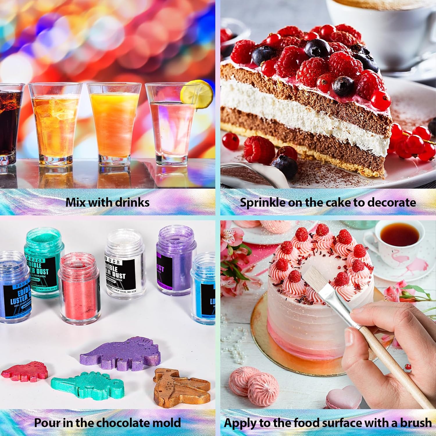 • Various Ways of Use: You can mix the luster dust directly with vodka, cocktails and other beverages to make sparkling starlight drinks; you can dip a brush into the pigment powder and apply it evenly on candy popsicles to make lovely patterns; you can apply the edible glitter directly on chocolate grinders to make dazzling chocolates; and you can sprinkle the glitter drink on cupcakes to make beautiful cakes in all colours, etc