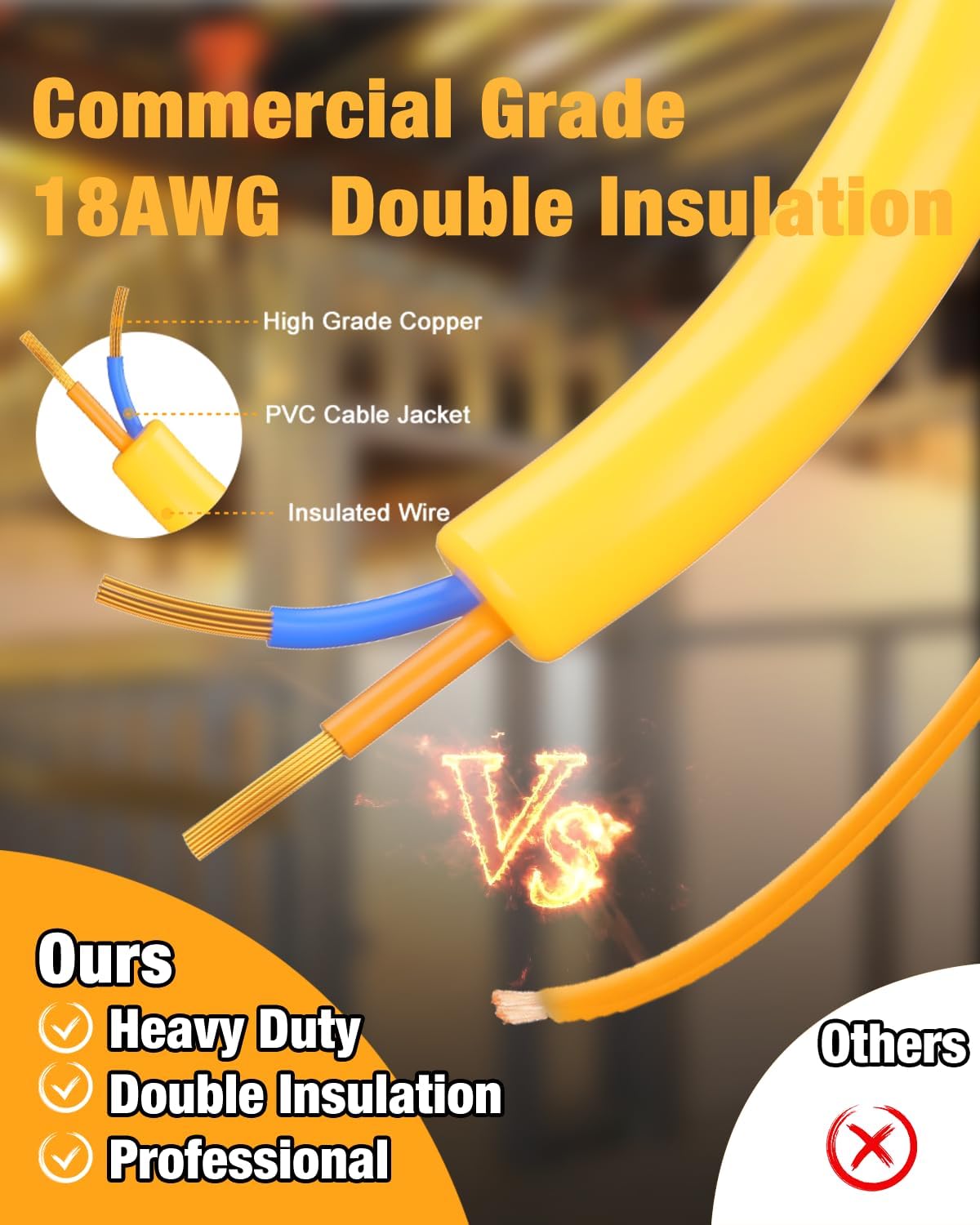 • ใ€Industrial Gradeใ€‘Adopts SJTW 2/18 AWG heavy-duty wire and high-precision oxygen-free tinned copper material for lower resistance and higher conductivity. IP65 waterproof tech can withstand extreme weather conditions and IK08 protection is enough to withstand shocks and vibrations, no need traditional cage and worry about bulb aging and damage. Sturdy and durable structure enhances the service life of the work light up to 50,000 hours.