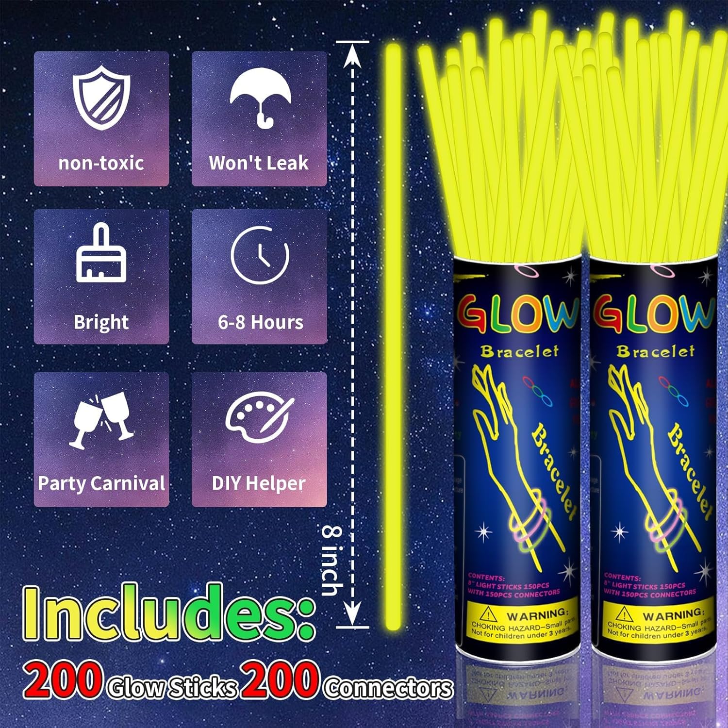 200 Pack 8'' Glow Sticks Bulk Party Favors Yellow Light Up Sticks with Connectors Neon Glow in the Dark Party Supplies Bracelets for Holiday Birthday Party Decoration(Yellow)