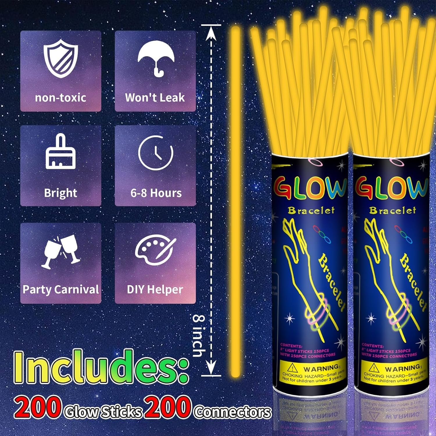 • 200 Pcs Glow Sticks:Our package contains 200 glow sticks and 200 connectors, making it easy to make glow stick bracelet. Make glowing bracelets with your friends!