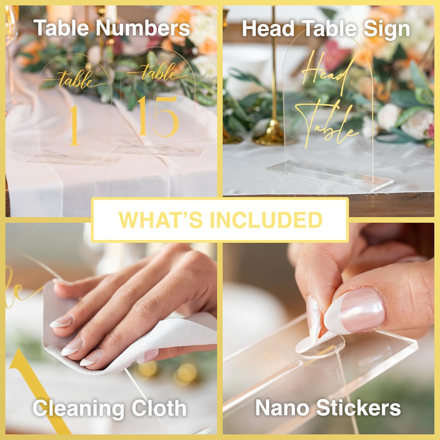 Clear Arch Acrylic Table Numbers for Wedding Reception - 5" x 7" Gold Font Centerpiece Set with Holder Stands & Head Table Sign - Anniversary, Event, Party, Wedding set 1-10