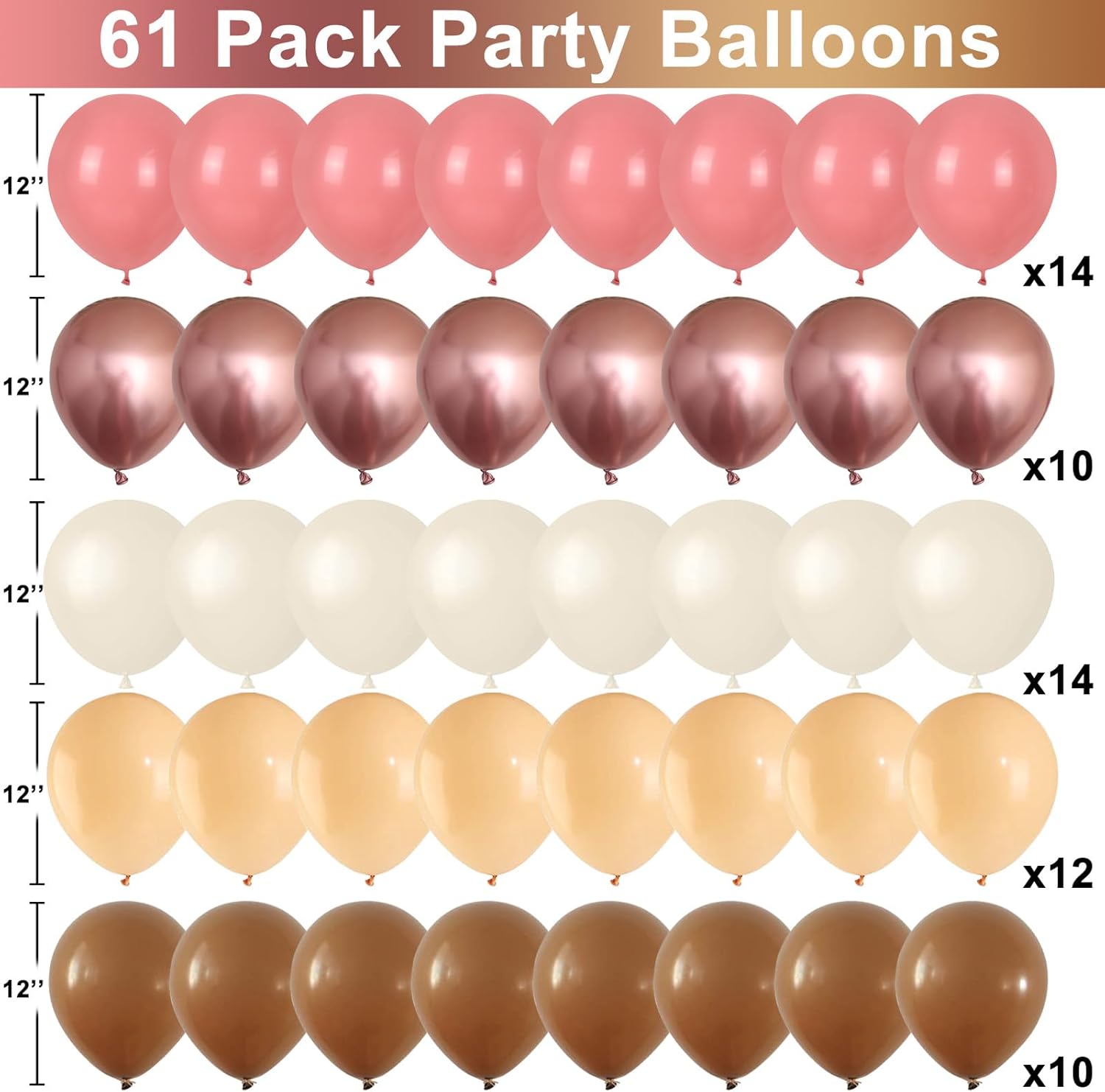 • ✨Boho Balloons Set: Our package includes 61pcs 12inch latex balloons (14pcs dusty pink balloons, 10pcs metallic rose gold balloons, 14pcs sand white balloons, 12pcs nude balloons, 10pcs coffee brown balloons) and 1pc balloon ribbon. Perfect for boho baby shower, birthday, or any occasion where elegance is key. Elevate your decor with these sleek and polished light brown pink latex balloons that will leave a lasting impression on your guests.