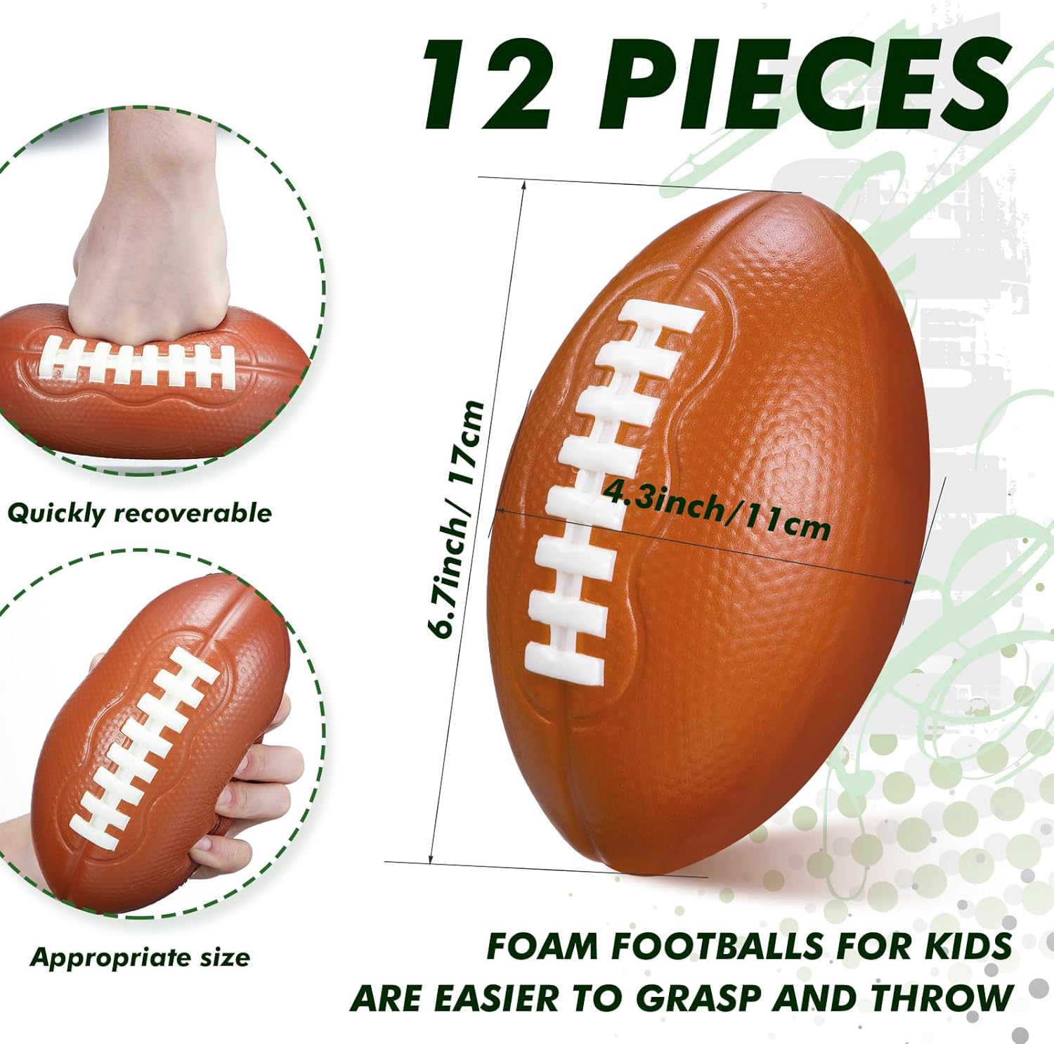 • Properly Sized: the size of our mini foam football is approximately 6.7 x 4.3 inches, lightweight and easy to grip, handle, and play with; It's not too big for small hands and not too small for big palms, a proper size to facilitate fun, active play for everyone involved