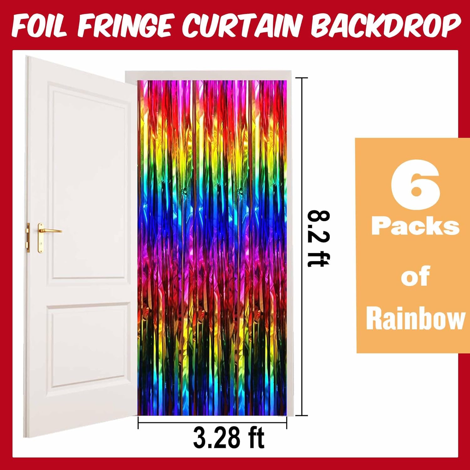 • Package and size: 6 Packs Foil Fringe Streamers Curtain Backdrop. The size is 3.28 x 8.2 feet. It's long, enough to fit any party occasion. Made of metallic foil material, shiny and creating dazzling effects, adding luxury and visual impact to the party