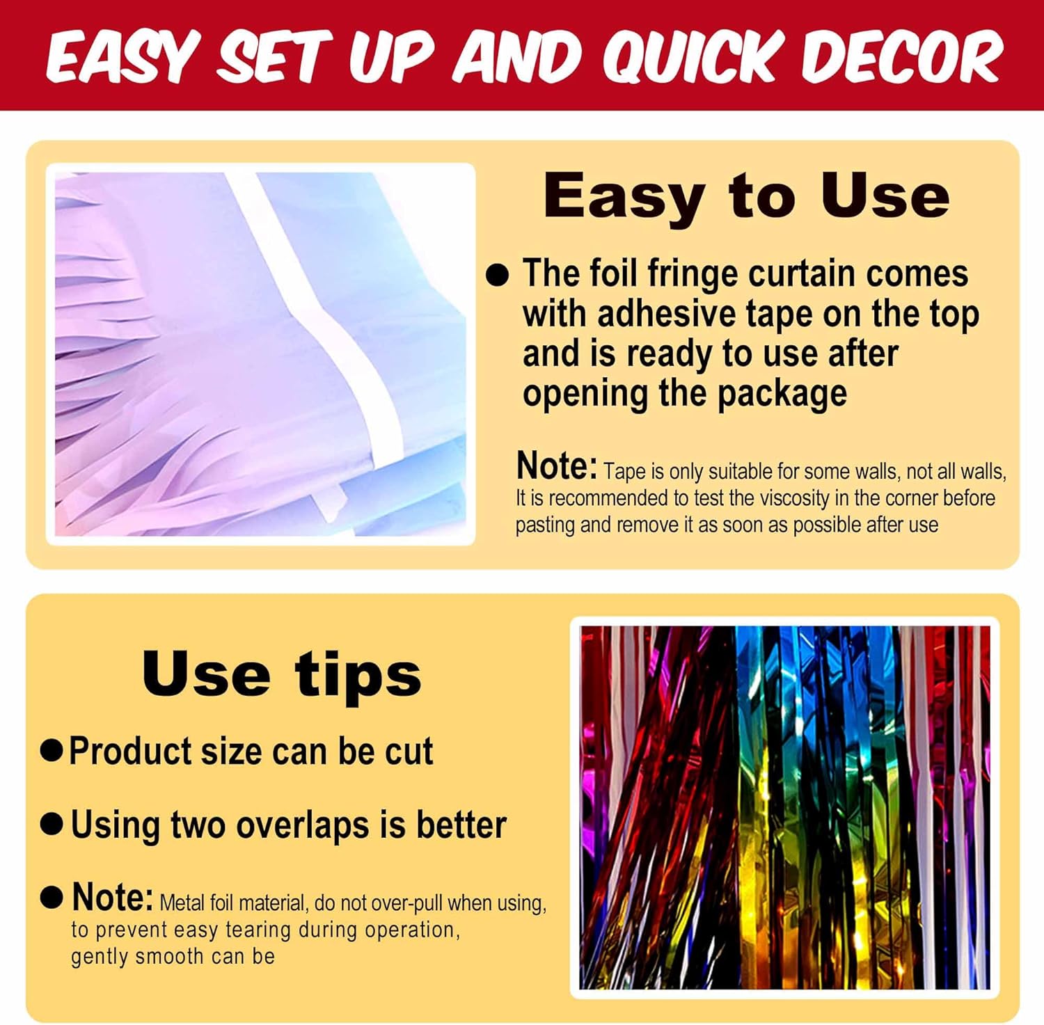 • Easy to Use: The tinsel foil fringe streamers curtain backdrop comes with double sided tape on the top, gently peel plastic strip off and it would be very easy to paste on smooth surfaces such as wall, window, table, door or anywhere you like