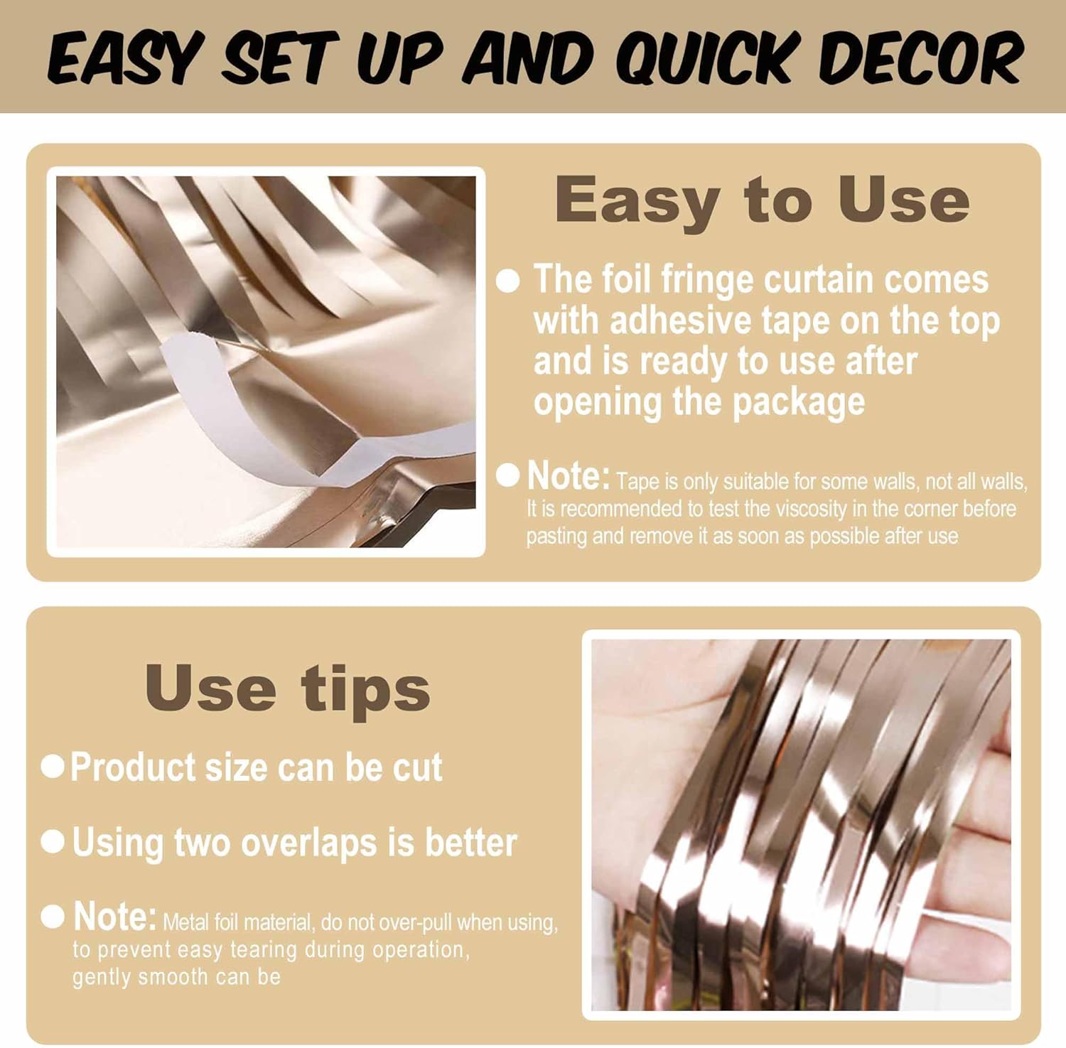 • Easy to Use: The tinsel foil fringe streamers curtain backdrop comes with double sided tape on the top, gently peel plastic strip off and it would be very easy to paste on smooth surfaces such as wall, window, table, door or anywhere you like