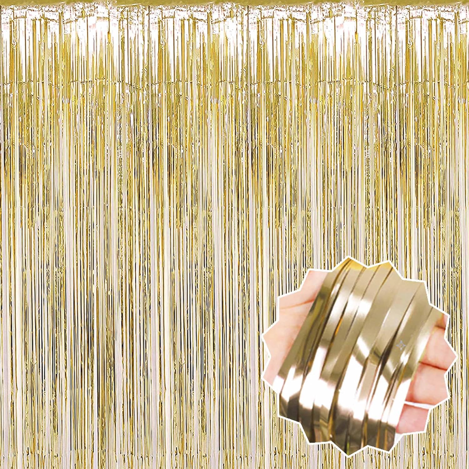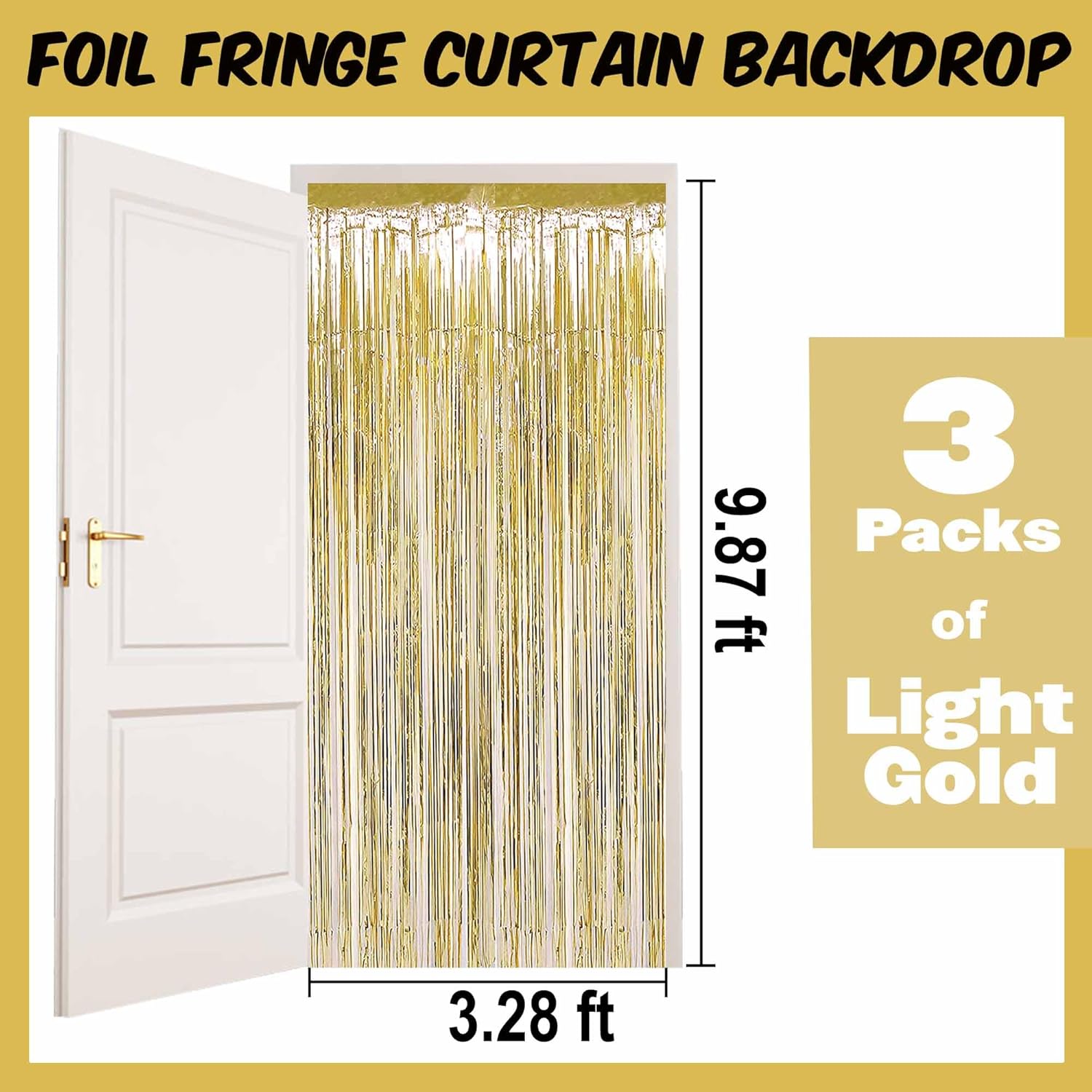 3 Pack Light Gold Foil Fringe Curtains Backdrop, 3.28 x 9.8 Ft Metallic Streamers Tinsel Curtains Background for Photo Booth, Birthday, Halloween, Christmas, Thanksgiving, New Year Party Decorations