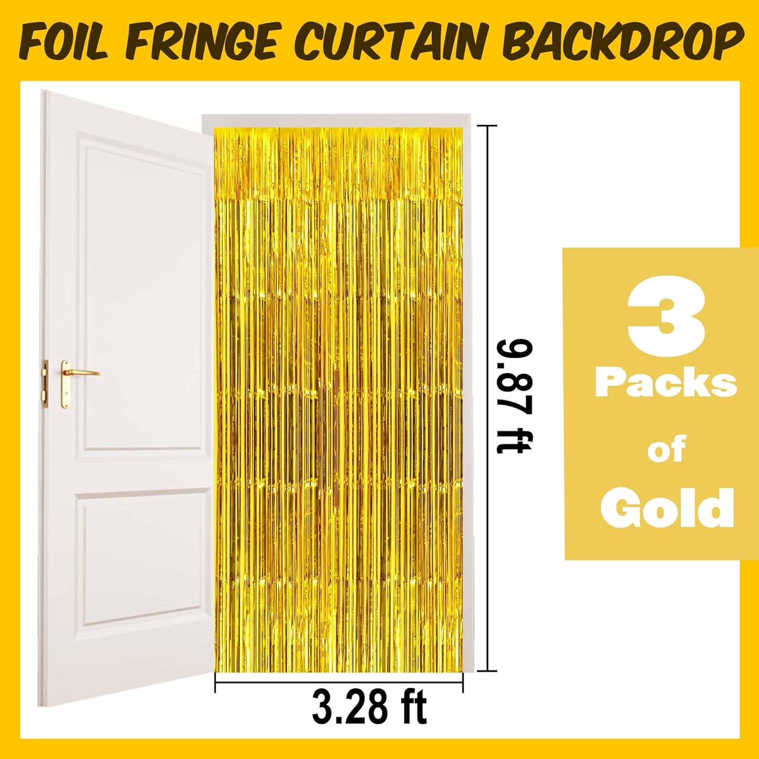 • Package and size: 3 Packs Foil Fringe Streamers Curtain Backdrop. The size is 3.28 x 9.8 feet. It's long, enough to fit any party occasion. Made of metallic foil material, shiny and creating dazzling effects, adding luxury and visual impact to the party