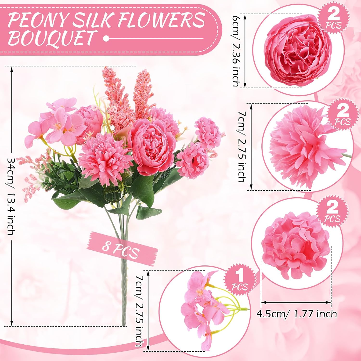 • Vibrant Splashes of Rose Red: this package includes 8 bouquets of rose red silk flowers in 7 heads, offering a stunning array of vibrant rose red shades to your decor; Each bouquet containing 7 prongs of 7 flowers, including 2 large peonies, 2 large ball chrysanthemums, 2 medium ball chrysanthemums, 1 large hydrangea, 3 foam fruit in the middle