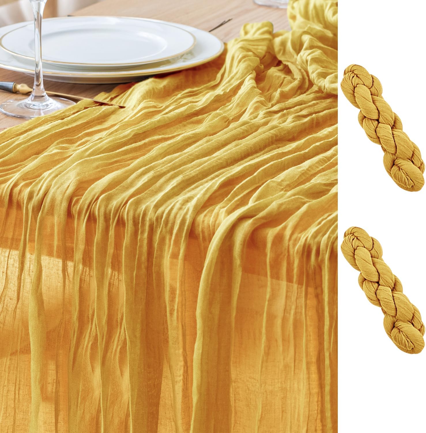 Asee'm 2pcs Cheesecloth Table Runner 120 Inches Long Gold Boho Gauze Cheese Cloth Runner 10FT Rustic Sheer Table Runners for Christmas Wedding Party Baby Shower Spring Easter Decoration