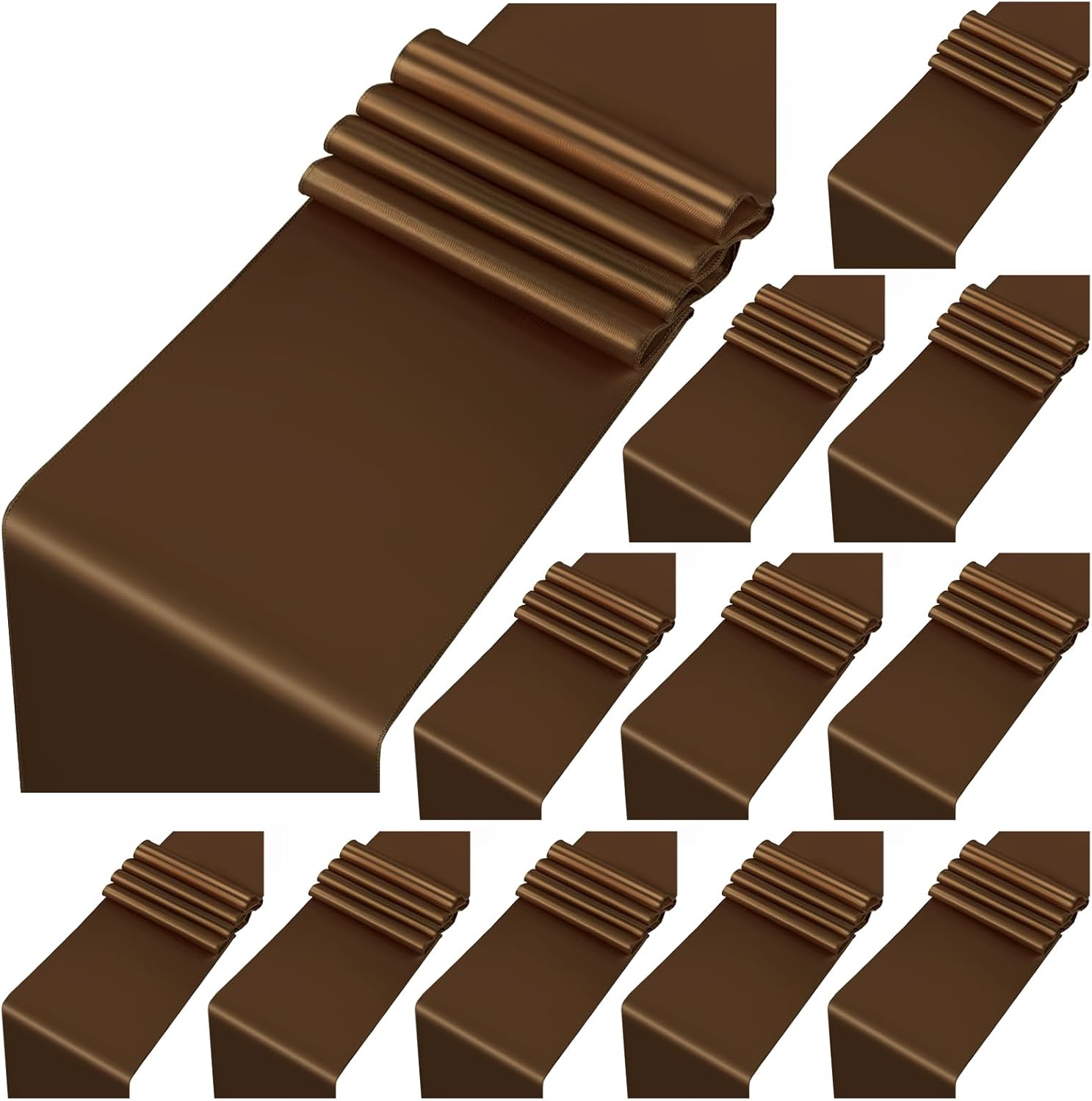 • 🧀【Brown Satin Table Runner Set】12 Pack brown satin table runner measures 12" x 108" in size, appropriate for a table that can seat 8-10 people. This satin table runner can fit a 6ft/8ft rectangular table or round table well.This satin table runner is great for event table decorations.Our satin table runner make your dining table more dazzling and outstanding.Purchase our 12piece satin table runner and save even more.
