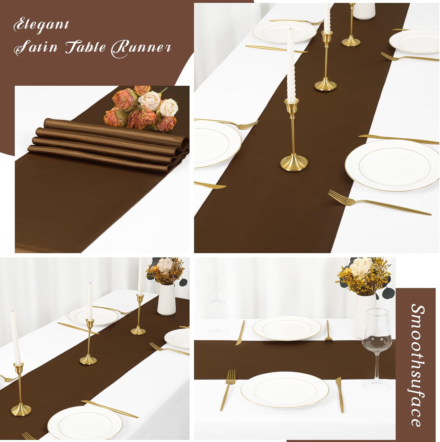 • 🧀【Perfect Finish】Brown satin table runner is made of delicate satin with smooth appearence.Neat seams with a clean look.Seamless, wrinkle-free, lightweight.Our satin table runners feature a refined, a solid color with an exquisite satin sheen that creates simple elegance.The seamless one-piece design making your party decorations shine when you add this silky-smooth runner on your table top.It's a great way to make your centerpieces and candles pop!