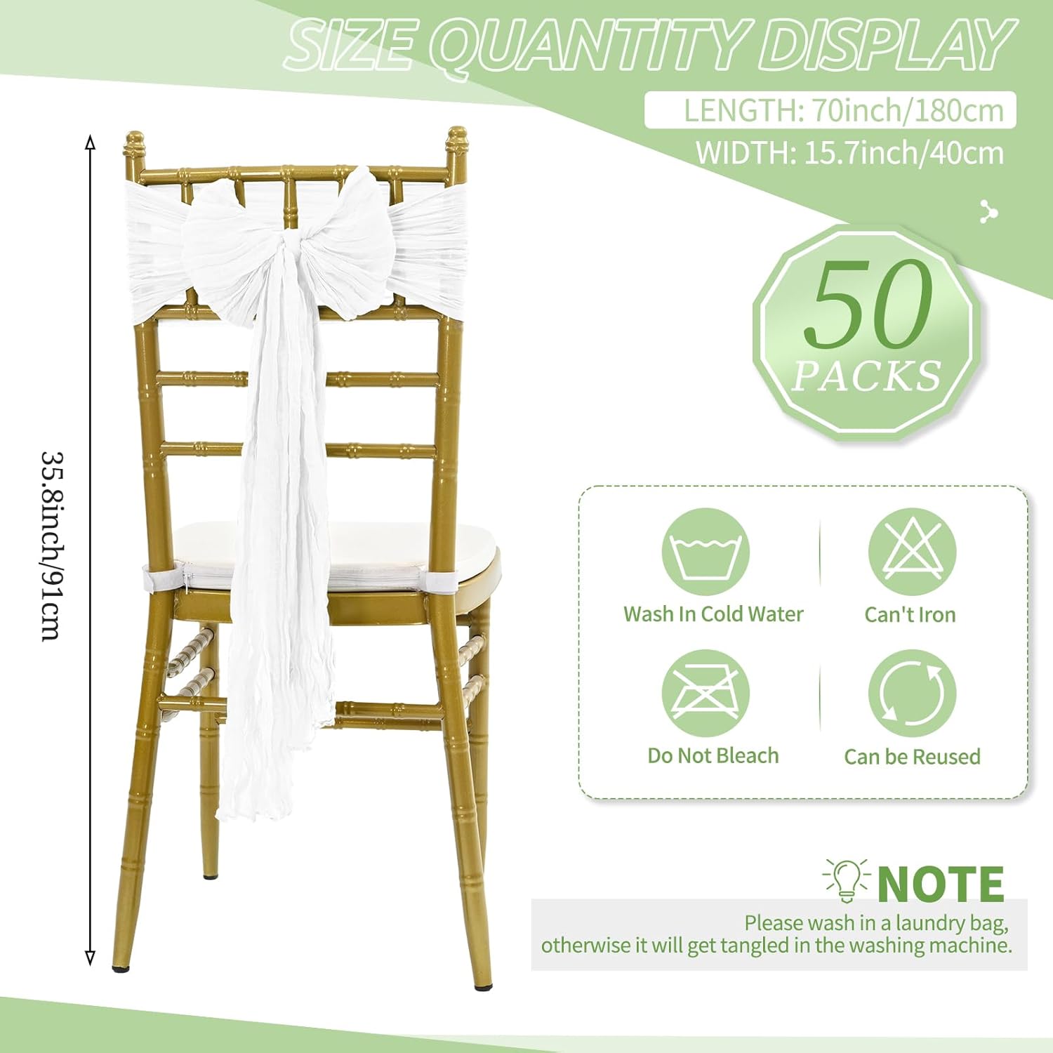 50 PCS Cheesecloth Chair Sashes Bows Wedding Aisle Decorations Chair Ribbon Ties Back Sash for Wedding Party Events Banquet Chair Cover Decoration (White)
