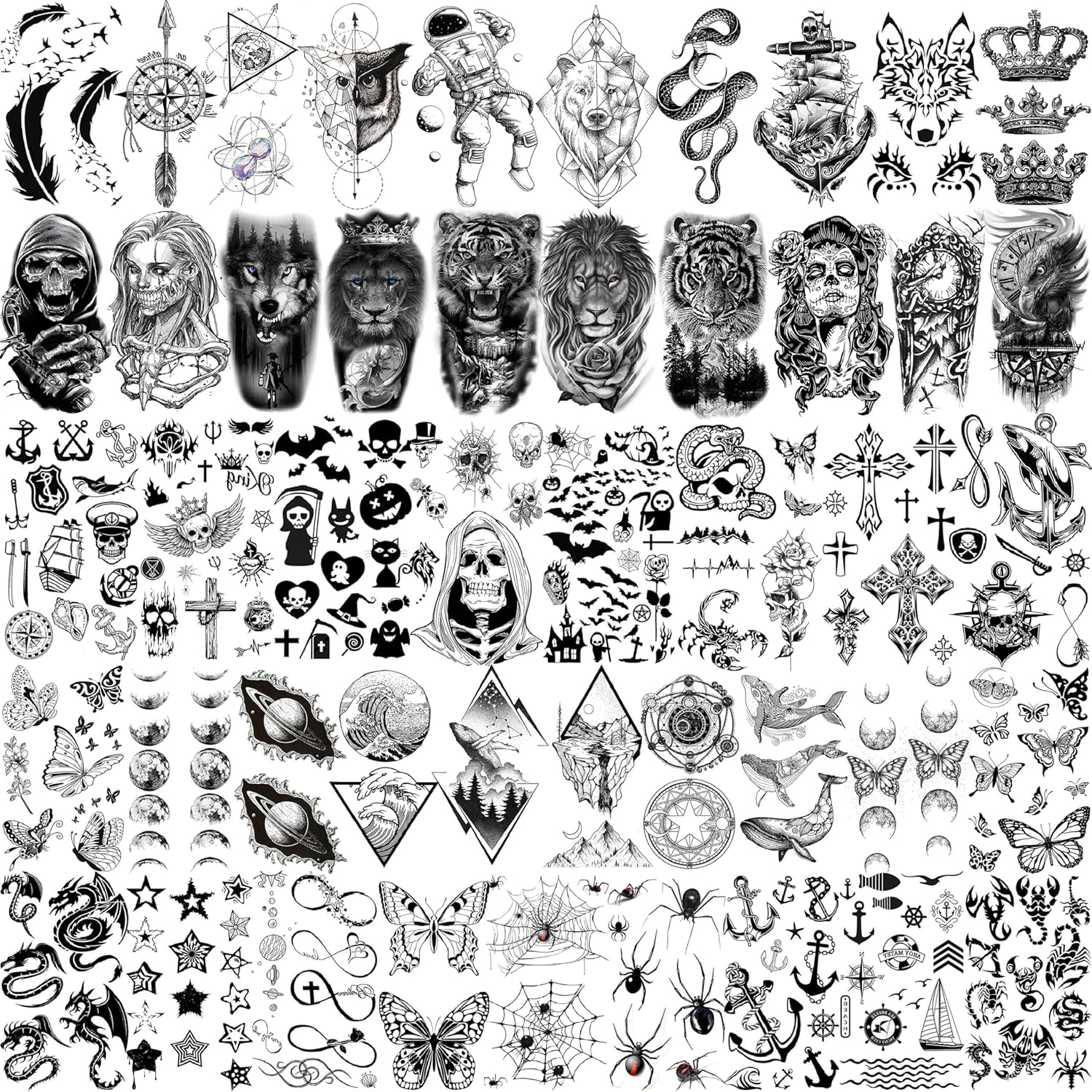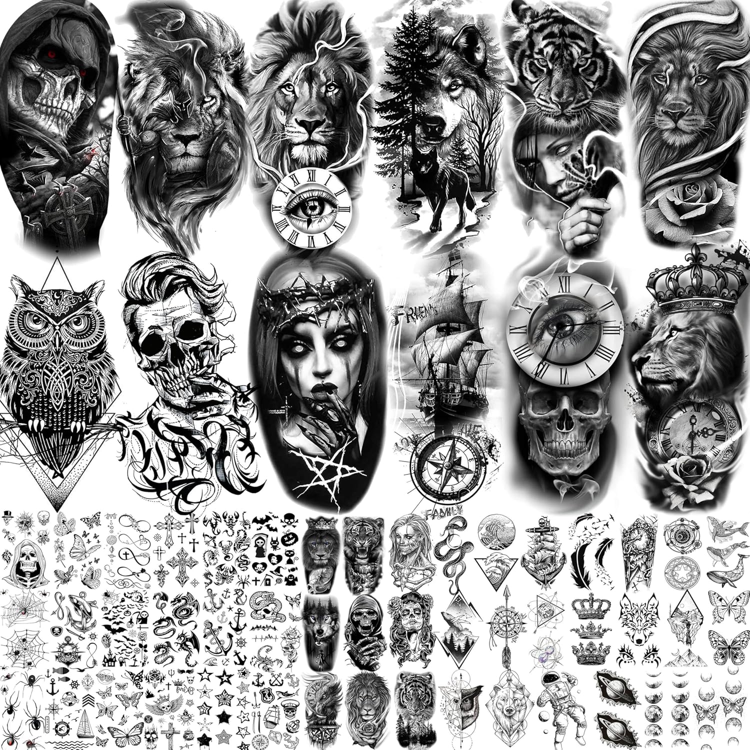 59 Sheets 3D Black Halloween Temporary Tattoos For Men Women Kids, Long Lasting Temp Fake Sleeeve Tattoos For Adults, Large Realistic Skull Skeleton Owl Wolf Lion Tiger Ship Tatoo Sticker Arm