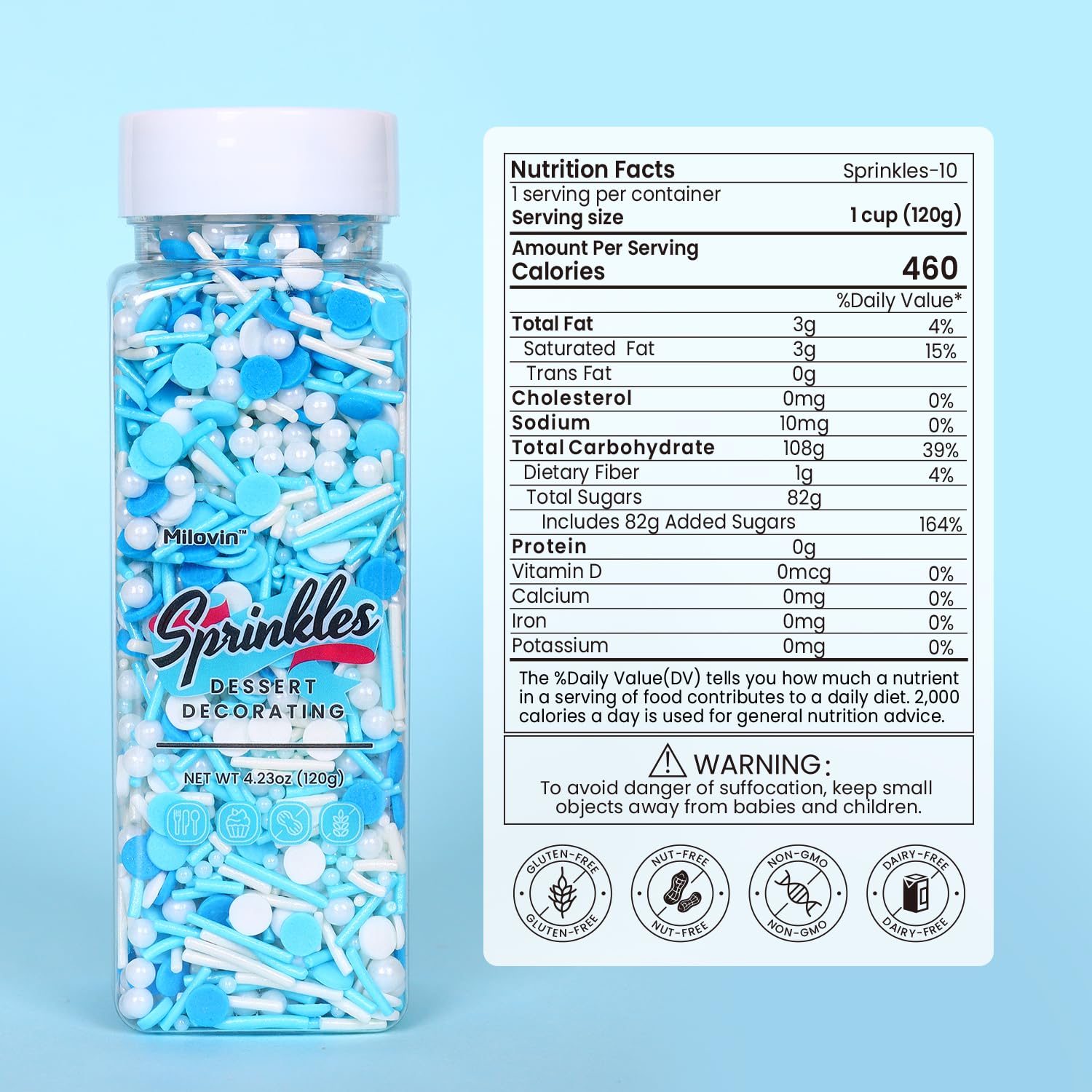 • High Quality and Safe: Made with food-grade ingredients. Edible, Gluten-free, Nut-free, Dairy-free, Non-GMO. Our blue and white sprinkles meet American food standards and guard your and your family's health.
